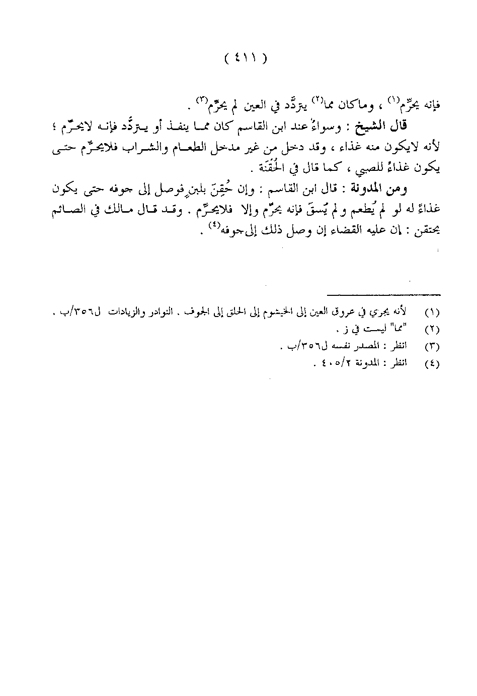 قال الشيخ: وسواءٌ عند ابن القاسم كان مما ينفذ أو يتردَّد فإنه لا يحرِّم؛ لأنه لا يكون منه غذاء, وقد دخل من غير مدخل الطعام والشراب فلا يحرُّم حتى يكون غذاءٌ للصبي, كما قال الحَقَنَة.