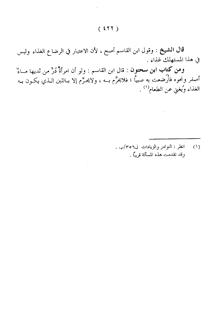 ومن كتاب ابن سحنون: قال ابن القاسم: ولو أن امرأةٌ دَرَّ من ثديها ماءٌ أصفر ونحوه فأرضعت به صبياً؛ فلا يحرَّم به, ولا يحرَّم إلا باللبن الذي يكون به الغذاء ويُغني عن الطعام.