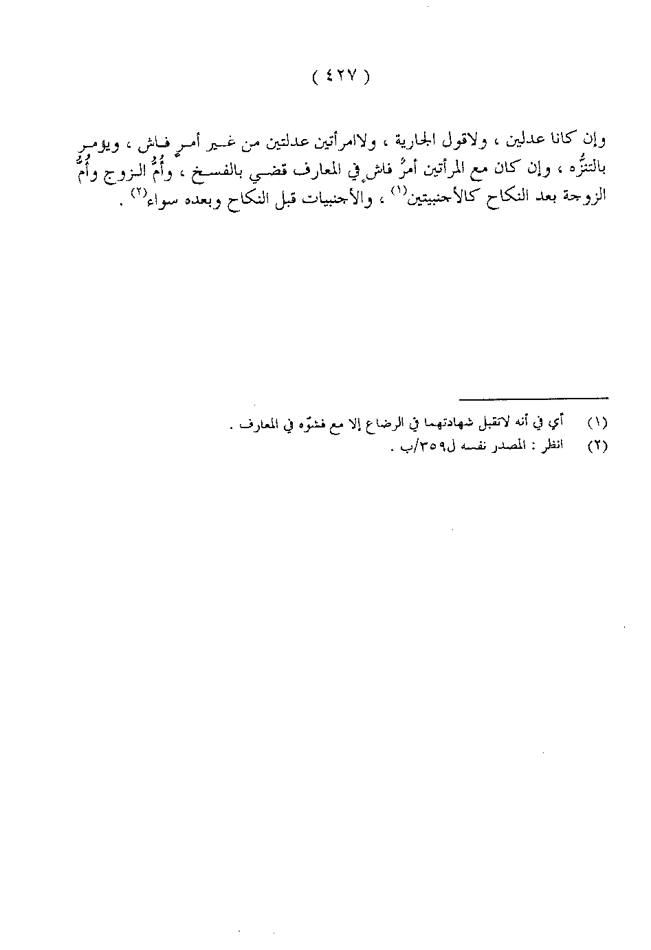 وإن كانا عدلين, ولا قول الجارية, ولا امرأتين عدلتين من غير أمرٍ فاشٍ, ويؤمر بالتنزُّه, وإن كان مع المرأتين أمرً فاشٍ في المعارف قضى بالفسخ, وأمُّ الزوج وأُمُّ الزوجة بعد النكاح كالأجنبيتين, والأجنبيات قبل النكاح وبعده سواء.