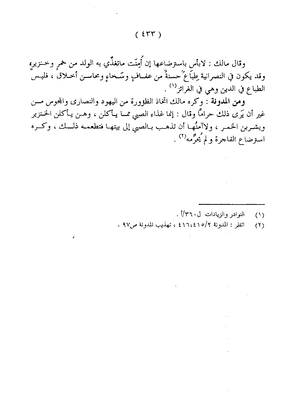 ومن المدونة: وكره مالك اتخاذ الظؤورة من اليهود والنصارى والمجوس من غير أن يَرى ذلك حراماً وقال: إنما غذاء الصبي مما يأكلن, وهن يأكلن الخنزير ويشربن الخمر, ولا آمنُها أن تذهب بالصبي إلى بيتها فتطعمه ذلك, وكره استرضاع الفاجرة ولم يُحرِّمه.