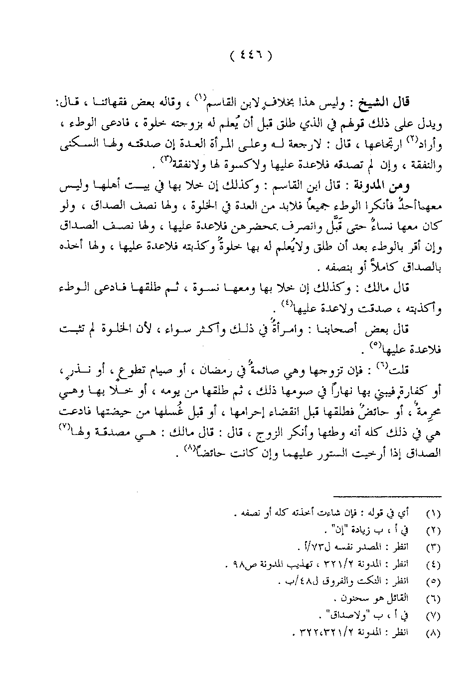 قال الشيخ: وليس هذا بخلافٍ لابن القاسم, وقاله بعض فقهائنا, قال: ويدل على ذلك قولهم في الذي طلق قبل أن يُعلم له بزوجته خلوة, فادعى الوطء, وأراد ارتجاعها, قال: لا رجعة له وعلى المرأة العدة إن صدقته ولها السكنى والنفقة, وإن لم تصدقه فلا عدة عليها ولا كسوة لها ولا نفقة.