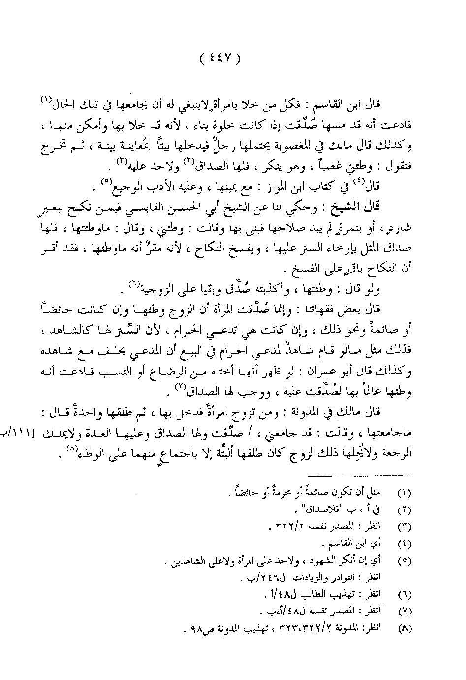 قال ابن القاسم: فكل من خلا بامرأةٍ لا ينبغي له أن يجامعها في تلك الحال فادعت أنه قد مسها صُدِّقت إذا كانت خلوة بناء, لأنه قد خلا بها وأمكن منها, وكذلك قال مالك في المغصوبة يحتملها رجلً فيدخلها بيتاً بمُعاينة بينه, ثم تخرج فتقول: وطئني غصباً, وهو ينكر, فلها الصداق ولا حد عليه.