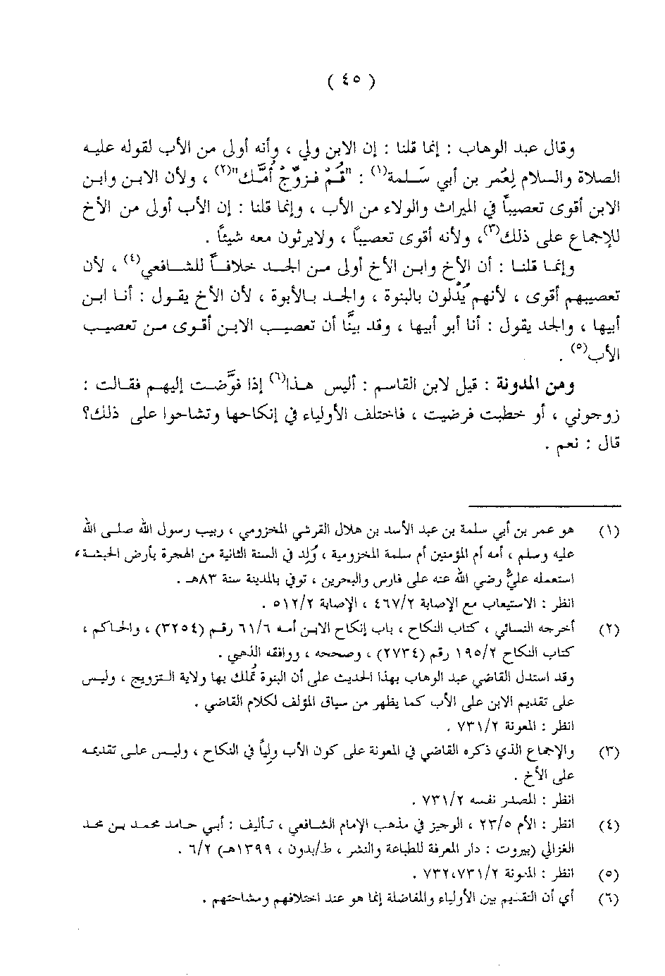 وقال عبد الوهاب: إنما قلنا: إن الابن ولي، وأنه أولى من الأب لقوله عليه الصلاة والسلام لِعُمر بن أبي سَلمة: «قُمْ فزوِّجْ أُمَّك»، ولأن الابن وابن الابن أقوى تعصيبًا في الميراث والولاء من الأب، وإنما قلنا: إن الأب أولى من الأخ للإجماع على ذلك، ولأنه أقوى تعصيبًا، ولا يرثون معه شيئًا.