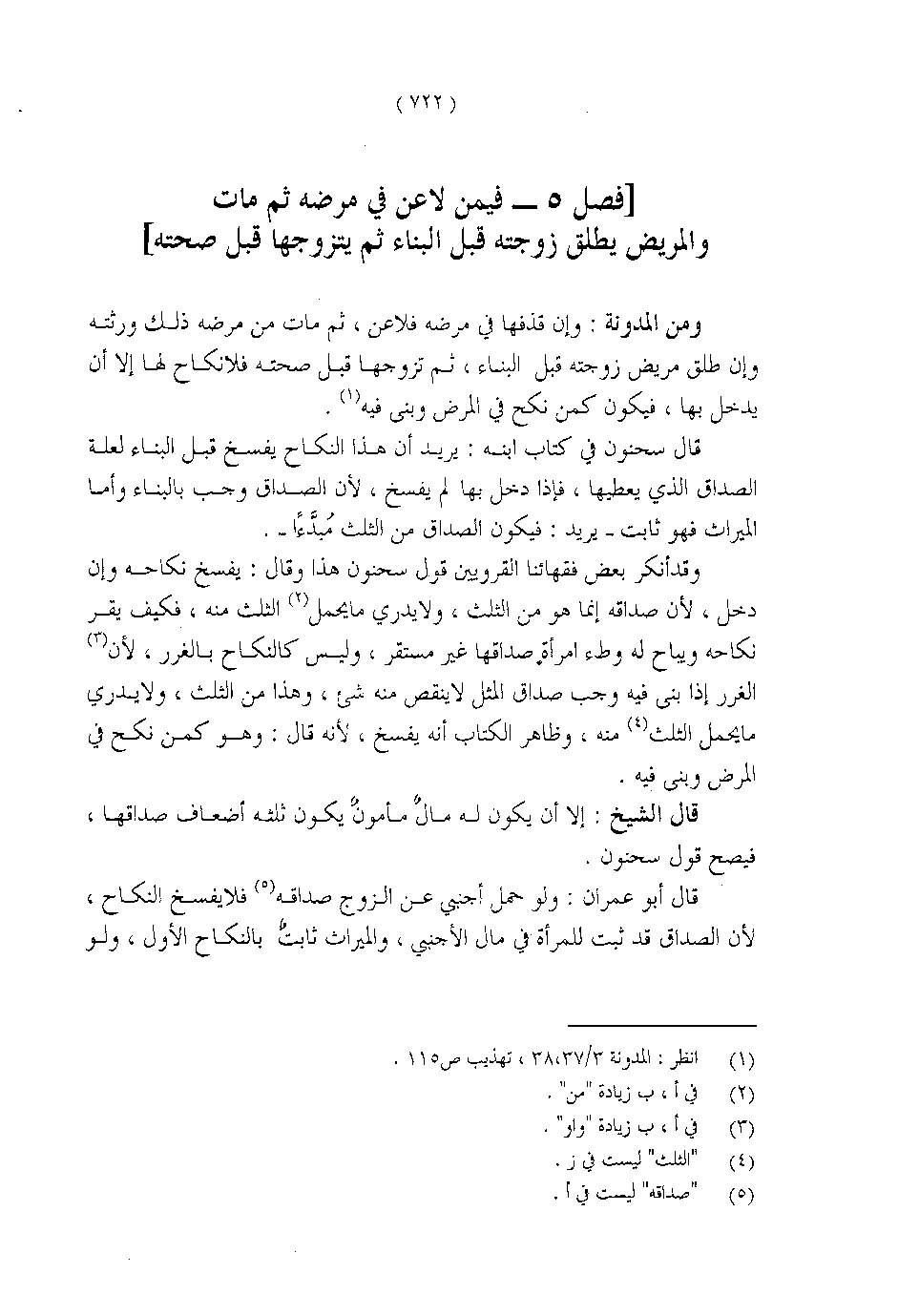 قال سحنون في كتاب ابنه: يريد أن هذا النكاح فسخ قبل البناء لعلة الصداق الذي يعطيها، فإذا دخل بها لم يفسخ، لأن الصداق وجب بالبناء وأما الميراث فهو ثابت- يريد: فيكون الصداق من الثلث مبدءاً-.