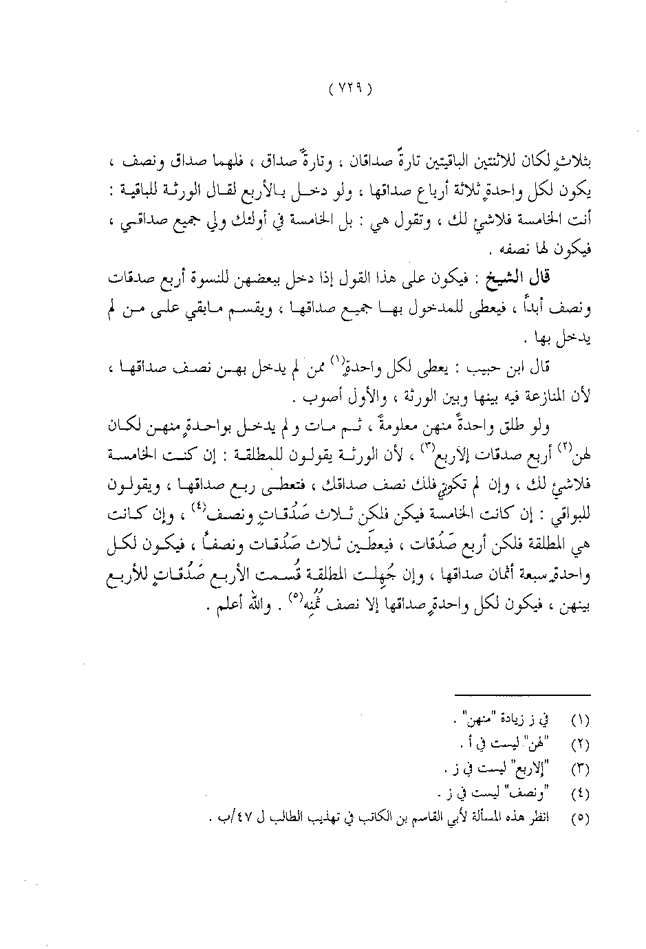 ولو طلق واحدةً منهن معلومة، ثم مات ولم يدخل بواحدةٍ منهن لكان لهن أربع صدقات إلا ربع، لأن الورثة يقولون للمطلقة: إن كنت الخامسة فلا شيء لك، وإن لم تكوني فلك نصف صداقك، فتعطى ربع صداقها، ويقولون للبواقي: إن كانت الخامسة فيكن فلكن ثلاث صدقات ونصف، وإن كانت هي المطلقة فلكن أربع صدقات، فيعطين ثلاث صدقات ونصفاً، فيكون لكل واحدة سبعة أثمان صداقها، وإن جهلت المطلقة فسمت الأربع صدقات للأربع بينهن، فيكون لكل واحدةٍ صداقها إلا نصف ثمنه. والله أعلم.
