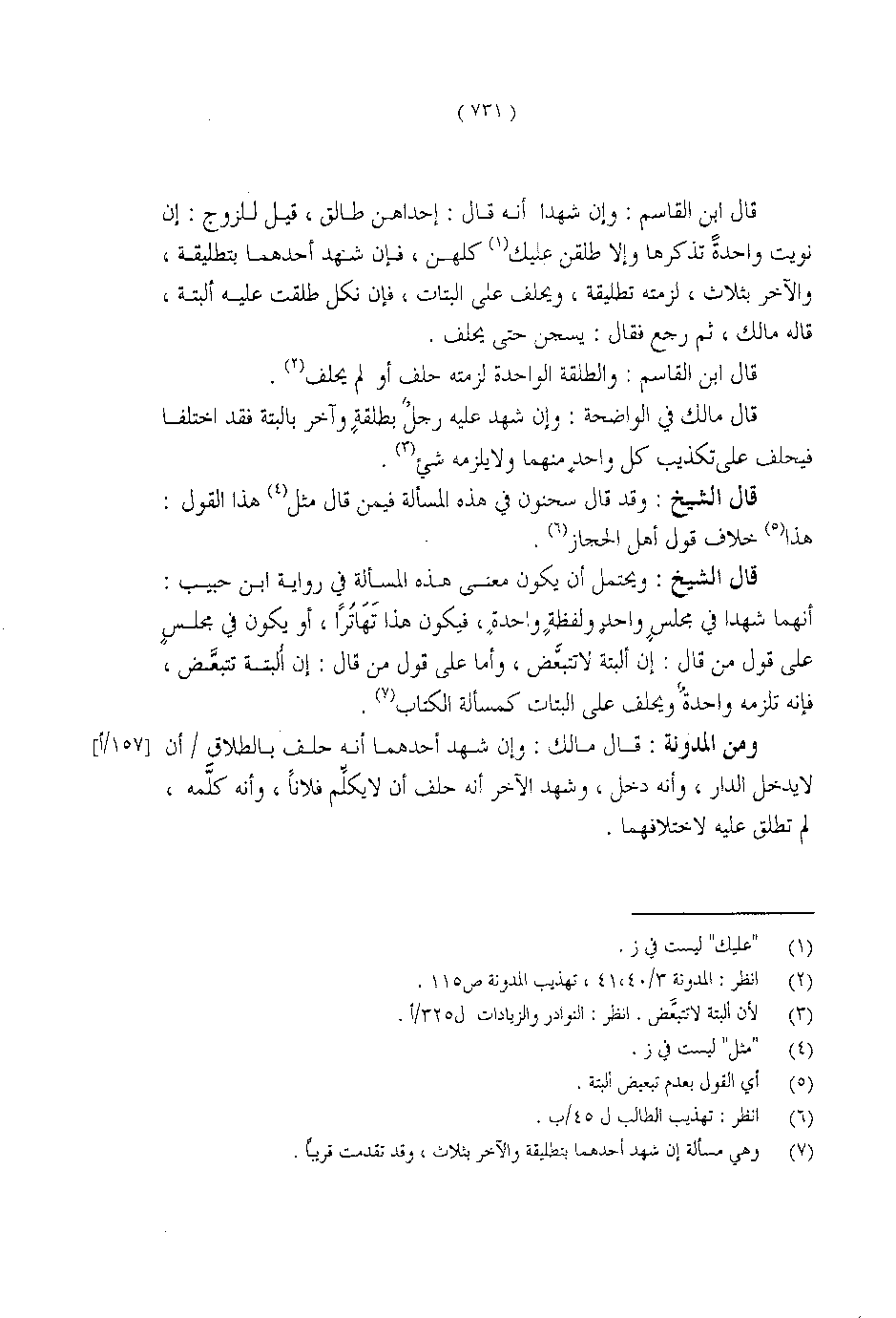 قال الشيخ: ويحتمل أن يكون معنى هذه المسألة في رواية ابن حبيب: أنهما شهدا في مجلسٍ واحدٍ ولفظةٍ واحدة، فيكون هذا تهاتراً، أو يكون في مجلسٍ على قول من قال: إن ألبتة لا تتبعض، وأما قول من قال: إن ألبتة تتبعض، فإن تلزمه واحدة ويحلف على البتات كمسألة الكتاب.