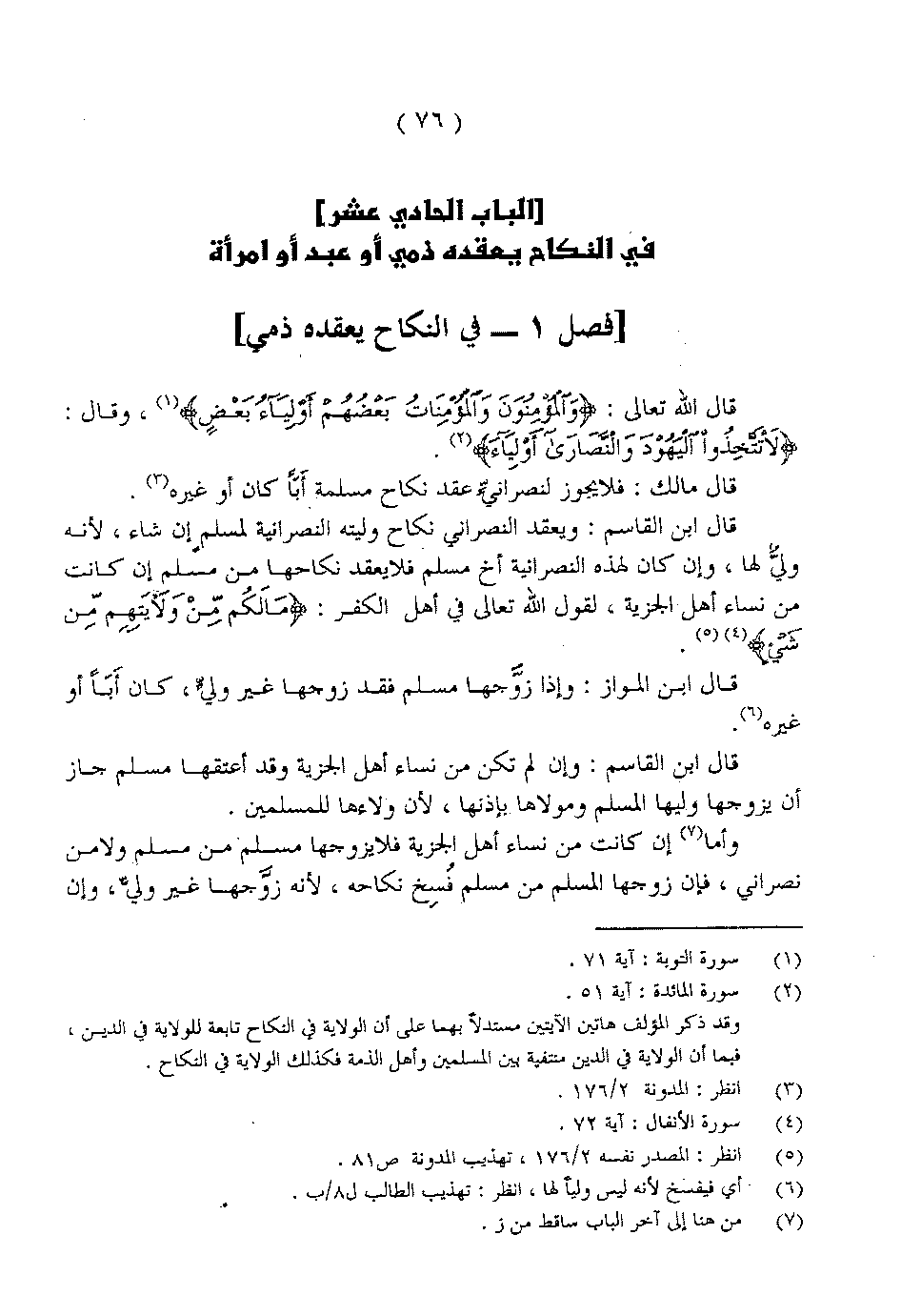 قال ابن القاسم: ويعقد النصراني نكاح وليته النصرانية لمسلمٍ إن شاء، لأنه وليٌّ لها، وإن كان لهذه النصرانية أخ مسلم فلا يعقد نكاحها من مسلم إن كانت من نساء أهل الجزية، لقول الله تعالى في أهل الكفر: {مَا لَكُمْ مِنْ وَلايَتِهِمْ مِنْ شَيْءٍ} [الأنفال: 72].