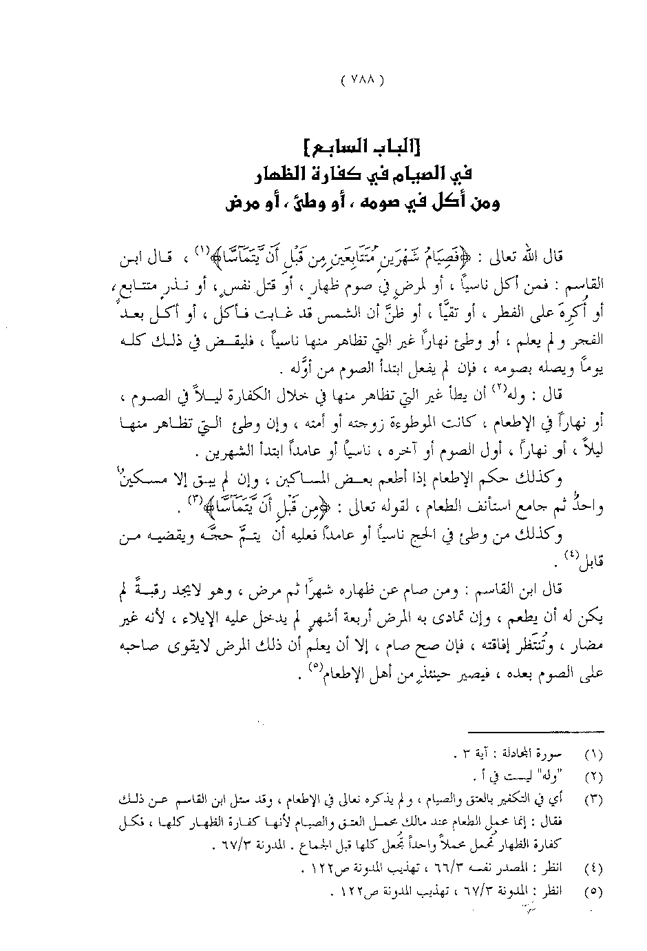 قال الله تعالى: {فَصِيَامُ شَهْرَيْنِ مُتَتَابِعَيْنِ مِنْ قَبْلِ أَنْ يَتَمَاسَّا}، قال ابن القاسم: فمن أكل ناسياً، أو لمرض في صوم ظهار، أو قتل نفسٍ، أو مذر متتابعٍ، أو أُكرِهَ على الفطر، أو تقيَّأ، أو ظنَّ أن الشمس قد غابت فأكل، أو أكل بعد الفجر ولم يعلم، أو وطئ نهاراً غير التي تظاهر منها ناسياً، فليقض في ذلك كله يوماً ويصله بصومه، فإن لم يفعل ابتدأ الصوم من أوَّله.