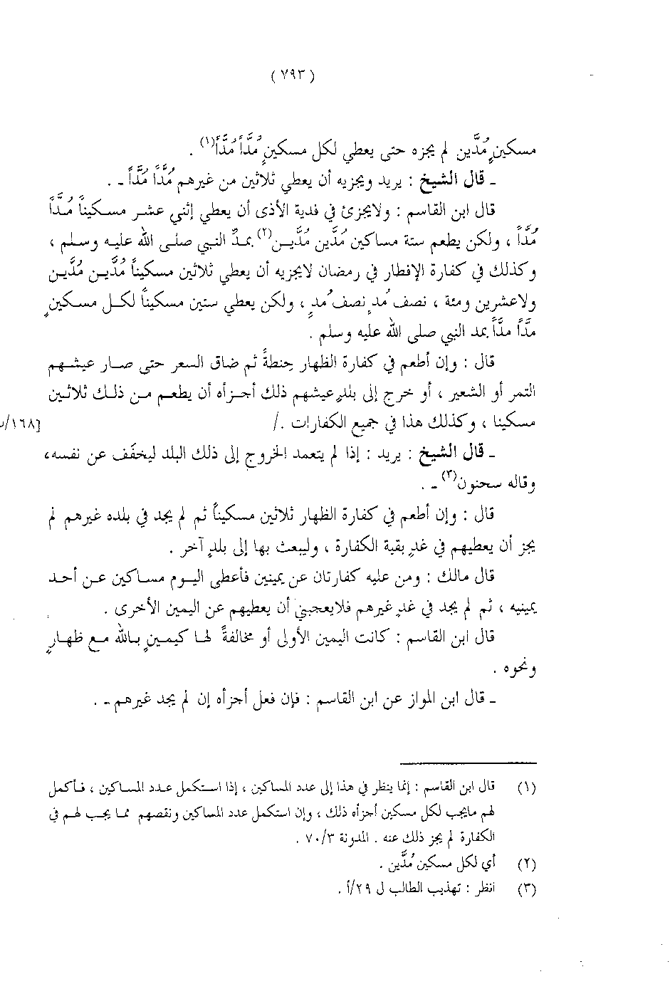 قال ابن القاسم: ولا يجزئ في فدية الأذى أن يعطي إثنى عشر مسكيناً مُدَّاً مُدَّاً، ولكن يطعم سنة مساكين مُدَّين مُدَّين بمدَّ النبي صلى الله عليه وسلم، وكذلك في كفارة الإفطار في رمضان لا يجزيه أن يعطي ثلاثين مسكيناً مُدَّين مُدَّين ولا عشرين ومئة، نصق مُدٍ نصف مُدٍ، ولكن يعطي سنين مسكيناً لكل مسكينٍ مدَّاً بمد النبي صلى الله عليه وسلم.