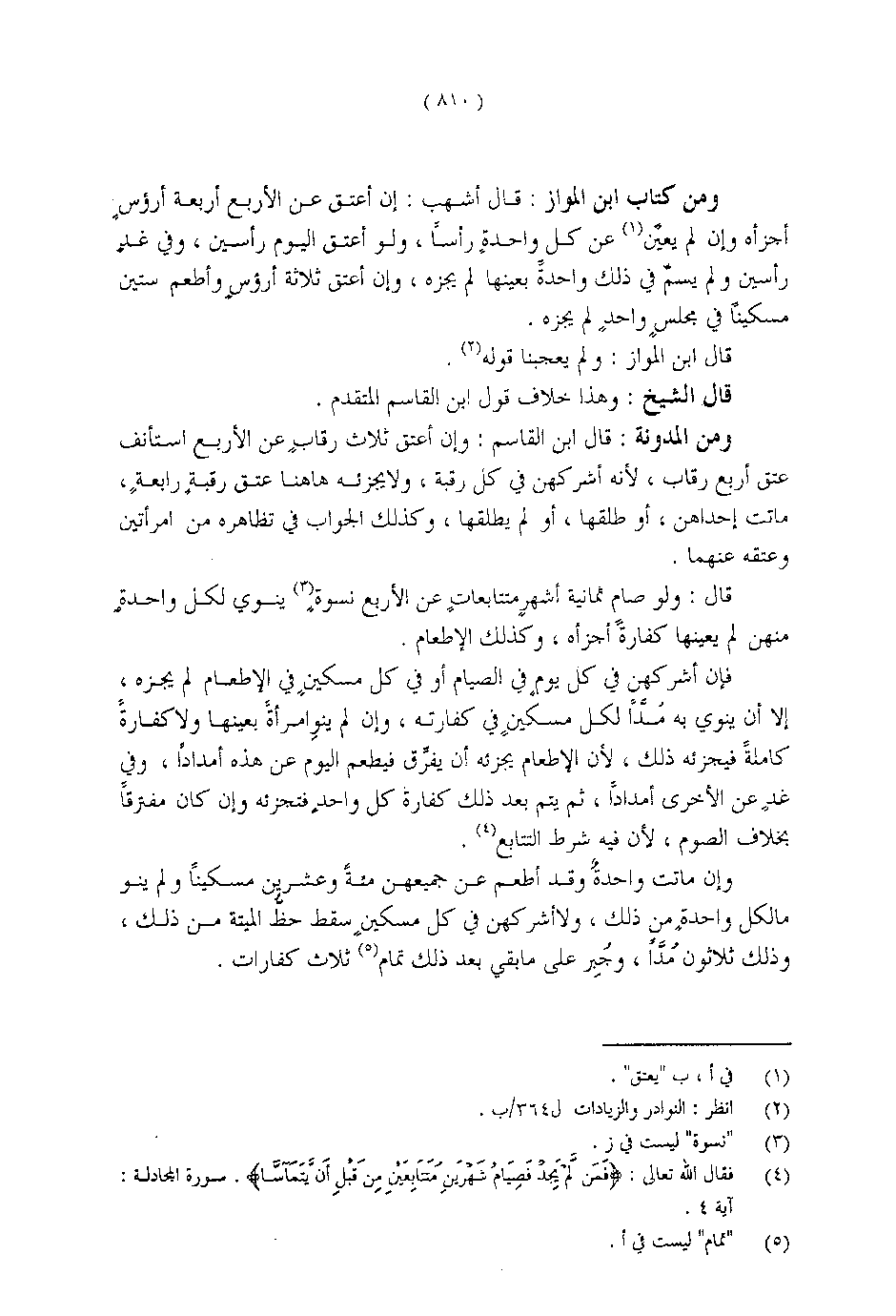 ومن المدونة: قال ابن القاسم: وإن أعتق ثلاث رقابٍ عن الأربع استأنف عتق أربع رقاب، لأنه أشركهن في كل رقبة، ولا يجزئه هاهنا عتق رقبةٍ رابعةٍ، ماتت إحداهن، أو طلقها، أو لم يطلقها، وكذلك الجواب في تظاهره في امرأتين وعتقه عنهما.