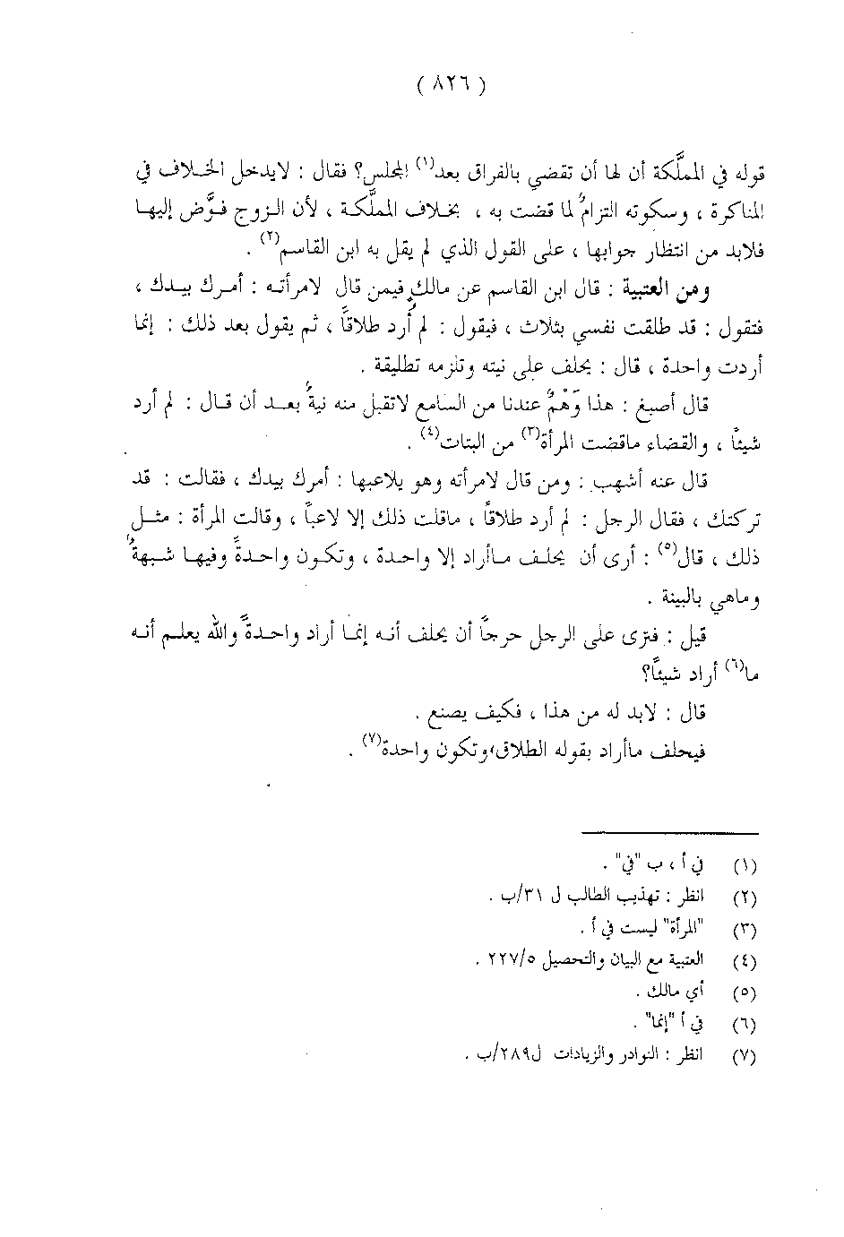 قوله في المملكة أن لها أم تقضي بالفراق بعد المجلس؟ فقال: لا يدخل الخلاف في المناكرة، وسكوته التزام جوابها علي القول الذي لم يقل به ابن القاسم.