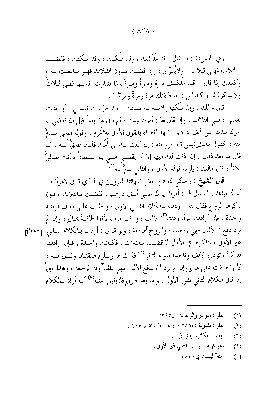 قال مالك: وإن ملكها ولا نية له فقالت: قد حرمت نفسي, أو أبنت نفسي, فهي الثلاث, وإن قال لها: أمرك بيدك, ثم قال لها أيضا قبل أن تقضي, أمرك بيدك على إلف درهم, فلها القضاء بالقول الأول بلا غرم, وقوله الثاني ندم منه, كقول مالك قيمن قال لزوجته: إن أذنت لك إلى أمك فأنت طالق البتة, ثم قال لها بعد ذلك: إن أذنت لك إليها إلا أن يقضي على به سلطان فأنت طالق ثلاثا, قال مالك: يلزمه قوله الأول, والثاني ندم منه.