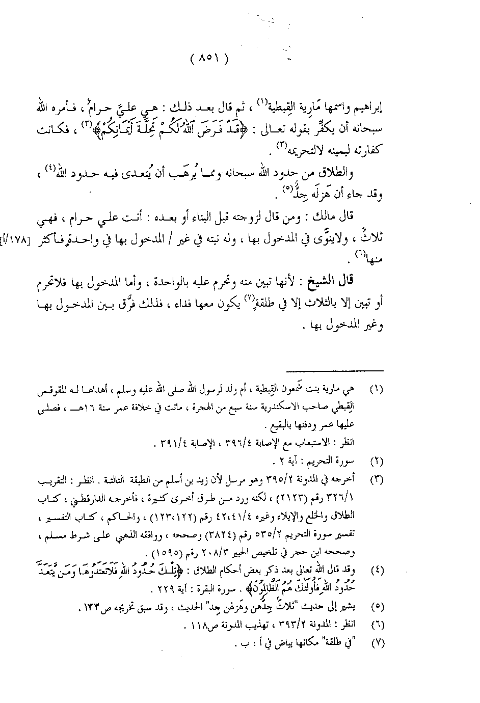 إبراهيم واسمها مَارٍية القِبطية، ثم قال بعد ذلك: هي علىَّ حرام، فأمره الله سبحانه أن يكفِّر بقوله تعالى: {قَدْ فَرَضَ اللَّهُ لَكُمْ تَحِلَّةَ أَيْمَانِكُمْ}، فكانت كفارته ليمينه لا لتحريمه.