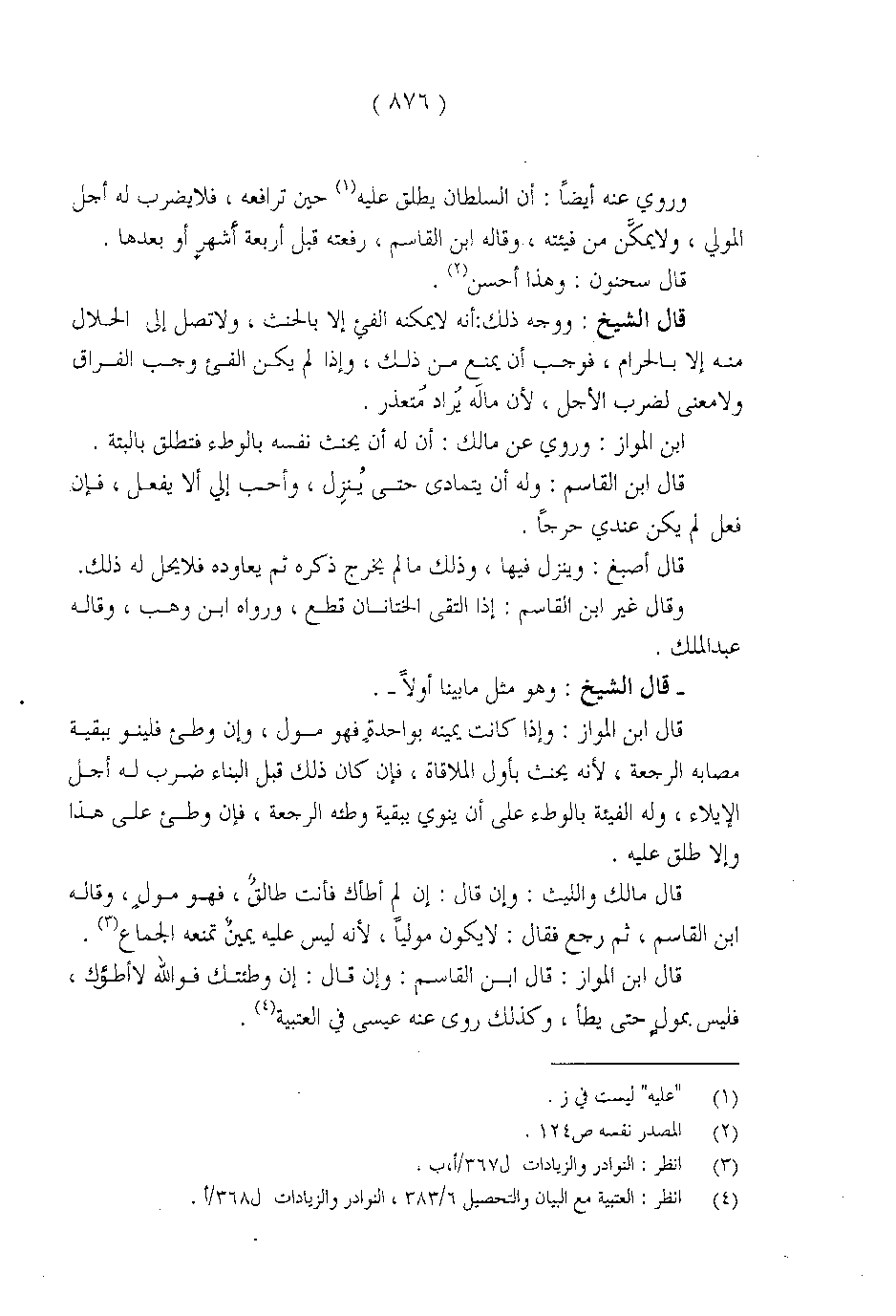 وروي عنه أيضاً: أن السلطان يطلق عليه حين ترافعه، فلا يضرب له أجل المولي، ولا يمكَّن من فيئته، وقاله ابن القاسم، رفعته قبل أربعة أشهرٍ أو بعدها.