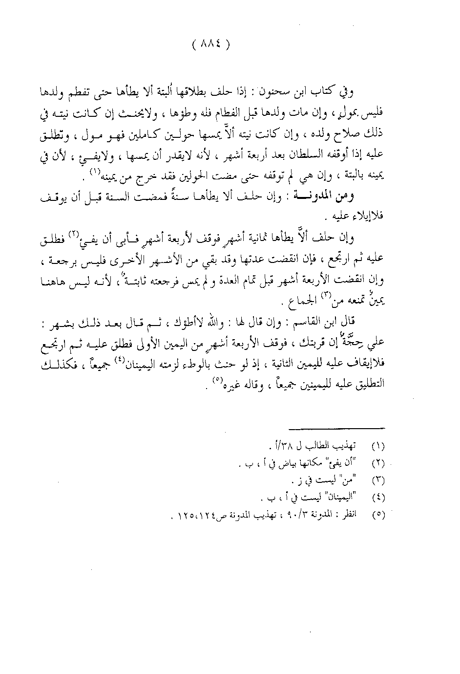 وفي كتاب ابن سحنون: إذا حلف بطلاقها ألبتة ألا يطأها حتى تفطم ولدها فليس بمولٍ، وإن مات ولده فليس بمولٍ، وإن مات قبل الفطام فله وطؤها، ولا يحنث إن كانت نيته في ذلك صلاح ولده، وإن كانت نيته إلاَّ يمسها حولين كاملين فهو مول، وتطلق عليه إذا أوقفه السلطان بعد أربعة أشهر، لأنه لا يقدر أن يمسها، ولا يفيء، لأن في يمينه بالبتة، وإن هي لم توقفه حتى مضت الحولين فقد خرج من يمينه.