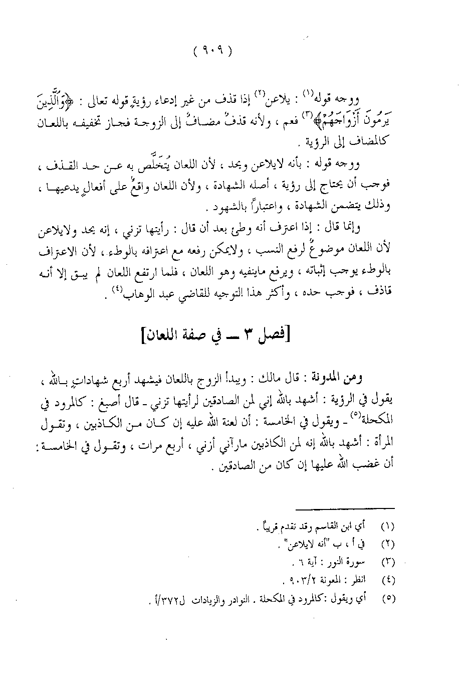 ومن المدونة: قال مالك: ويبدأ الزوج باللعان فيشهد أربع شهادات بالله، يقول في الرؤية: أشهد بالله إني لمن الصادقين لرأيتها تزني - قال أصبغ: كالمرود في المكحلة - ويقول في الخامسة: أن لعنة الله عليه إن كان من الكاذبين، وتقول المرأة: أشهد بالله لمن الكاذبين ما رآني أزني، أربع مرات، وتقول في الخامسة: أن غضب الله عليها إن كان من الصادقين.