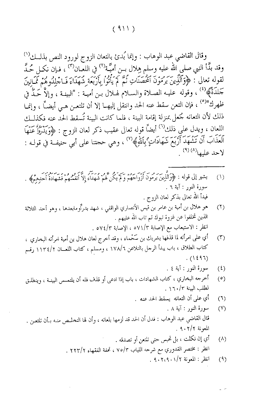 وقال القاضي عبد الوهاب: وإنما بدئ بالتعان الزوج لو رود النص بذلك وقد بدأ النبي صلى الله عليه وسلم هِلال بن أميَّة في اللعان، فإن نكل حَدَّ لقوله تعالى: {وَالَّذِينَ يَرْمُونَ الْمُحْصَنَاتِ ثُمَّ لَمْ يَاتُوا بِأَرْبَعَةِ شُهَدَاءَ فَاجْلِدُوهُمْ ثَمَانِينَ جَلْدَةً}، وقوله صلى الله عليه وسلم هِلال بن أمية: "البينة، وإلاَّ حّد في ظهرك"، فغن التعن سقط عن الحد وانتقل إليها إلا أن تلتعن هي أيضاً، وإنما ذلك لأن التعانه جُعل بمنزلة إقامة البينة، فلما كانت البينة تُسقط الحد عنه فكذلك اللعان، ويدل على ذلك أيضاً قوله تعالى عقيب ذكر لعان الزوج: {وَيَدْرَأُ عَنْهَا الْعَذَابَ أَنْ تَشْهَدَ أَرْبَعَ شَهَادَاتٍ بِاللَّهِ}، وهي حجتنا على أبي حنيفة في قوله: لا حد عليها.