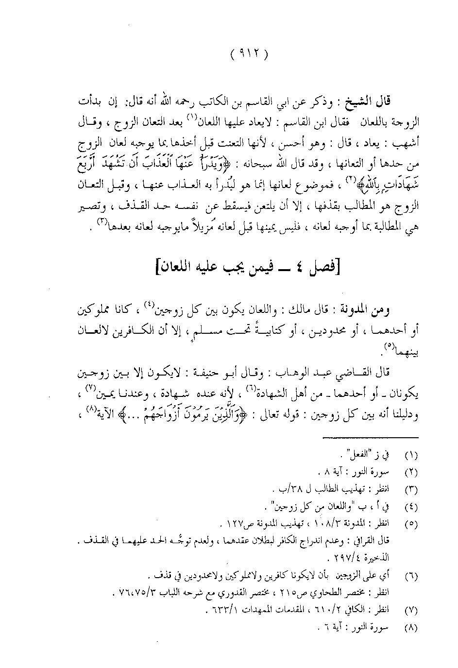 قال الشيخ: وذكر عن ابن القاسم بن الكاتب رحمه الله أنه قال: إن بدأت الزوجة باللعان فقال ابن القاسم: لا يعاد عليها اللعان بعد التعان الزوج، وقال أشهب: يعاد، قال: وهو أحسن، لأنها التعتت قبل أخذها بما يوجبه لعان الزوج من حدها أو التعانها، وقد قال الله سبحانه: {وَيَدْرَأُ عَنْهَا الْعَذَابَ أَنْ تَشْهَدَ أَرْبَعَ شَهَادَاتٍ بِاللَّهِ}، فموضوع لعانها إنما هو ليُدرأ به العذاب عنها، وقبل التعان الزوج هو المطالب بقذفها، إلا أن يلتعن فيسقط عن نفسه حد القذف، وتصير هي المطالبة بما أوجبه لعانه، فليس يمينها قبل لعانه مزيلاً ما يوجبه لعانه بعدها.