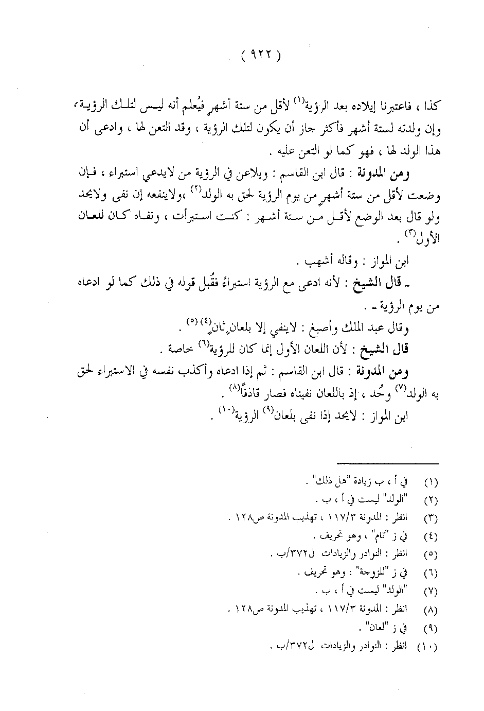 ومن المدونة: قال ابن القاسم: ويلاعن في الرؤية من لا يدعي استبراء، فإن وضعت لأقل من ستة أشهرٍ من يوم الرؤية لحق به الولد، ولا ينفعه إن نفى ولا يحد ولو قال بعد بعد الوضع لأقل من ستة أشهر: كنت استبرأت، ونفاه كان للعان الأول.