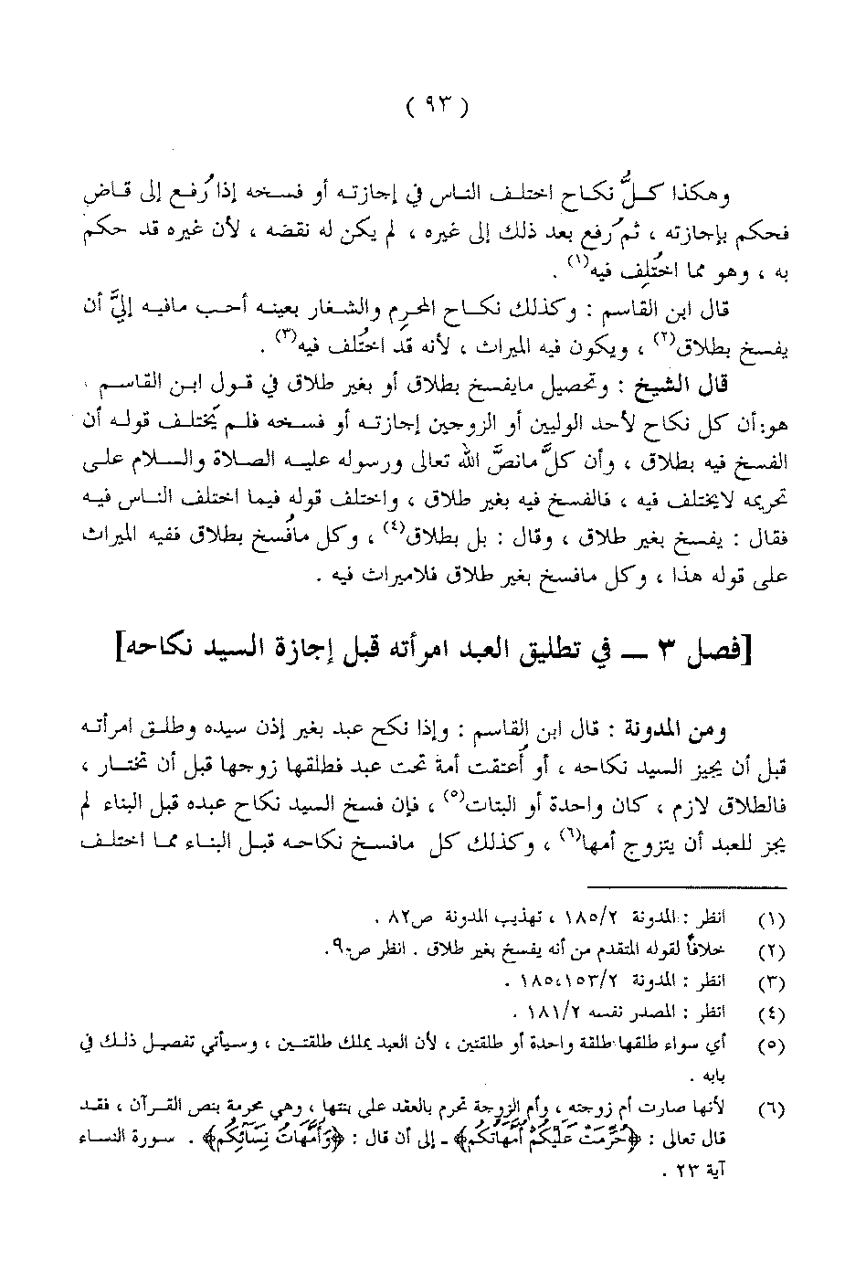 قال الشيخ: وتحصيل ما يفسخ بطلاق أو بغير طلاق في قول ابن القاسم، هو: أن كل نكاح لأحد الوليين أو الزوجين إجازته أو فسخه فلم يَختلف قوله أن الفسخ فيه بطلاق، وأن كلَّ ما نصَّ الله تعالى ورسوله عليه الصلاة والسلام على تحريمه لا يختلف فيه، فالفسخ فيه بغير طلاق، واختلف قوله فيما اختلف الناس فيه فقال: يفسخ بغير طلاق، وقال: بل بطلاق، وكل ما فُسخ بطلاق ففيه الميراث على قوله هذا، وكل ما فسخ بغير طلاق فلا ميراث فيه.
