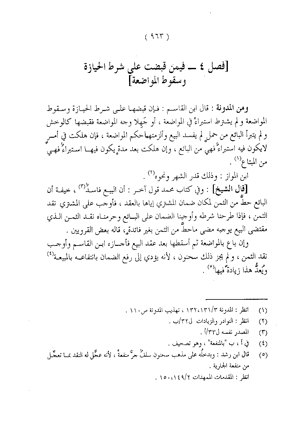 [قال الشيخ]: وفي كتاب محمد قول آخر: أن البيع فاسد، خيفة أن البائع حطَّ من الثمن لمكان ضمان المشتري إياها بالعقد، فأوجب على المشتري نقد الثمن، فإذا طرحنا شرطه وأوجبنا الضمان على البائع وحرمناه نقد الثمن الذي مقتضي البيع يوجبه مضى ما حطَّ من الثمن بغير فائدةٍ، قاله بعض القرويين.