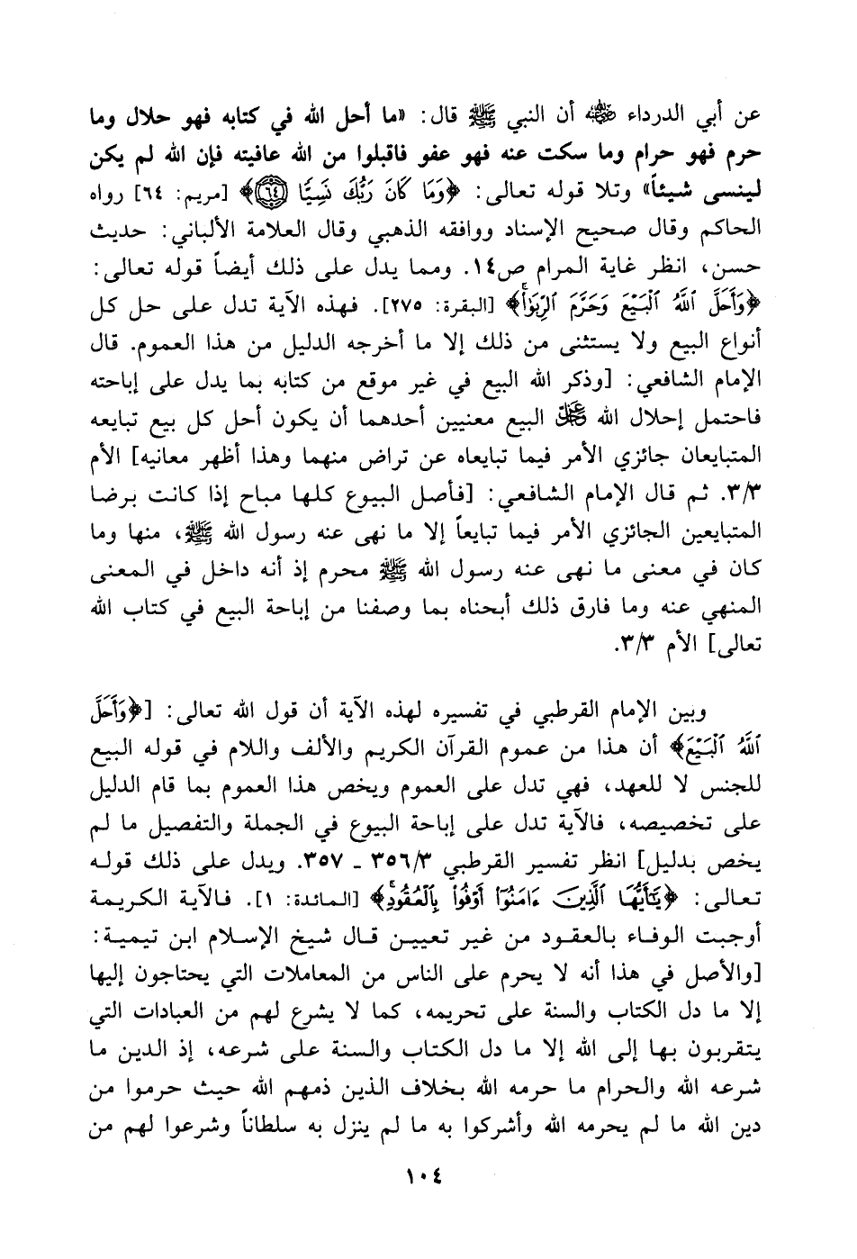 عن أبي الدرداء - رضي الله عنه - أن النبي - صَلَّى اللهُ عَلَيْهِ وَسَلَّمَ - قال: (ما أحل الله في كتابه فهو حلال وما حرم فهو حرام وما سكت عنه فهو عفو فاقبلوا من الله عافيته فإن الله لم يكن لينسى شيئاً وتلا قوله تعالى: (وَمَا كَانَ رَبُّكَ نَسِيًّا) سورة مريم الآية 64) رواه الحاكم وقال صحيح الإسناد ووافقه الذهبي وقال العلامة الألباني حديث حسن، انظر غاية المرام ص14. ومما يدل على ذلك أيضاً قوله تعالى: {وَأَحَلَّ اللَّهُ الْبَيْعَ وَحَرَّمَ الرِّبَا} سورة البقرة الآية 275. فهذه الآية تدل على حل كل أنواع البيع ولا يستثنى من ذلك إلا ما أخرجه الدليل من هذا