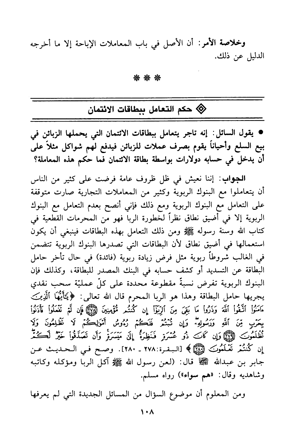الجواب: إننا نعيش في ظل ظروف عامة فرضت على كثير من الناس أن يتعاملوا مع البنوك الربوية وكثير من المعاملات التجارية صارت متوقفة على التعامل مع البنوك الربوية ومع ذلك فإني أنصح بعدم التعامل مع البنوك الربوية إلا في أضيق نطاق نظراً لخطورة الربا فهو من المحرمات القطعية في كتاب الله وسنة رسوله - صَلَّى اللهُ عَلَيْهِ وَسَلَّمَ - ومن ذلك التعامل بهذه البطاقات فينبغي أن يكون استعمالها في أضيق نطاق لأن البطاقات التي تصدرها البنوك الربوية تتضمن في الغالب شروطاً ربوية مثل فرض زيادة ربوية (فائدة) في حال تأخر حامل البطاقة عن التسديد أو كشف حسابه في البنك المصدر للبطاقة، وكذلك فإن البنوك الربوية تفرض نسبةً مقطوعة محددة على كلّ عمليّة سحب نقدي يجريها حامل البطاقة وهذا هو الربا المحرم قال الله تعالى: {يَا أَيُّهَا الَّذِينَ آمَنُواْ اتَّقُواْ اللهَ وَذَرُواْ مَا بَقِيَ مِنَ الرِّبَا إِن كُنتُم مُّؤْمِنِينَ فَإِن لَّمْ تَفْعَلُواْ فَأْذَنُواْ بِحَرْبٍ مِّنَ اللهِ وَرَسُولِهِ وَإِن تُبْتُمْ فَلَكُمْ رُؤُوسُ أَمْوَالِكُمْ لاَ تَظْلِمُونَ وَلاَ تُظْلَمُونَ وَإِن كَانَ ذُو عُسْرَةٍ فَنَظِرَةٌ إِلَى مَيْسَرَةٍ وَأَن تَصَدَّقُواْ خَيْرٌ لَّكُمْ إِن كُنتُمْ تَعْلَمُونَ} سورة البقرة الآيتان 278 - 279. وصح في الحديث عَنْ جَابِر بن عبد الله رضي الله عنهما قَال: (لَعَنَ رَسُولُ اللَّهِ - صَلَّى اللهُ عَلَيْهِ وَسَلَّمَ - آكِلَ الرِّبَا وَمُؤكِلَهُ وَكَاتِبَهُ وَشَاهِدَيْهِ وَقَالَ هُمْ سَوَاءٌ) رواه مسلم.