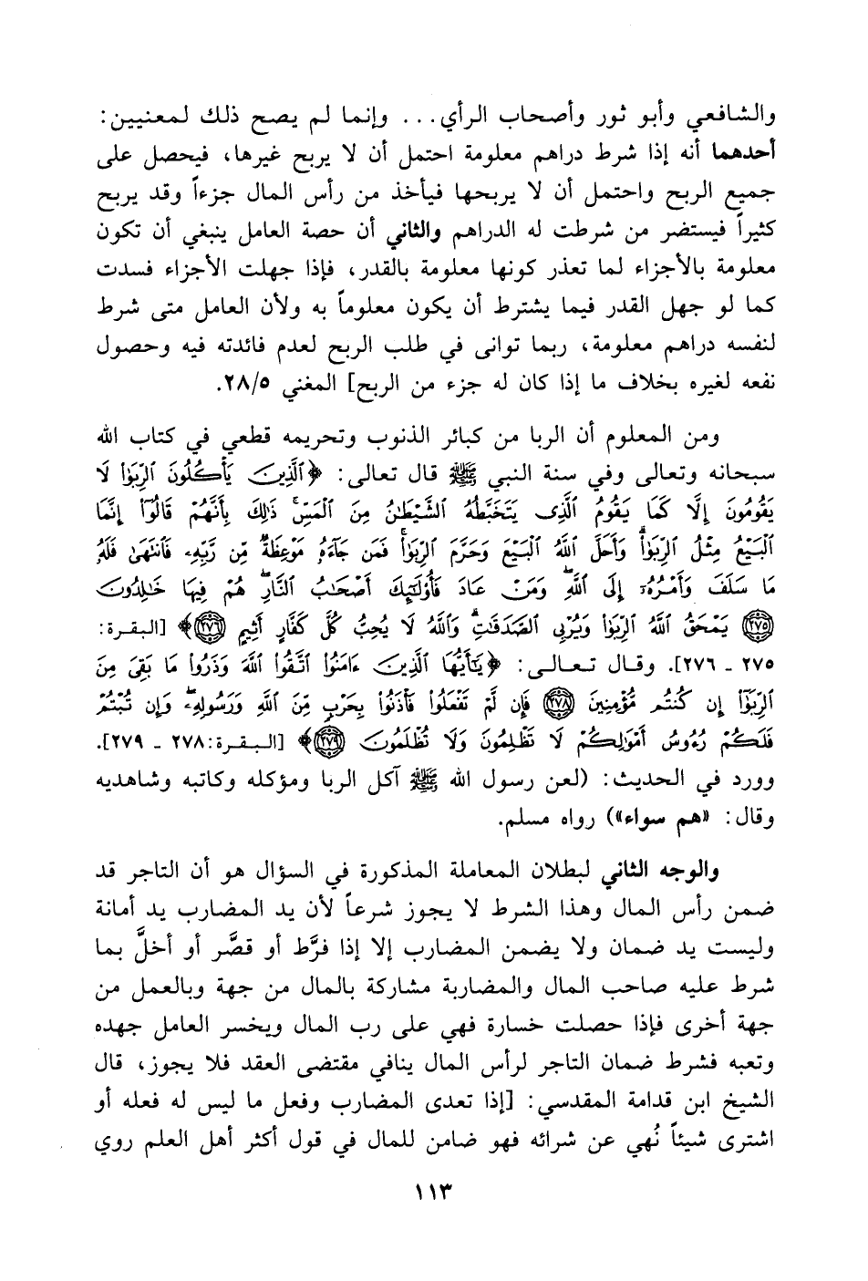 ومن المعلوم أن الربا من كبائر الذنوب وتحريمه قطعي في كتاب الله سبحانه وتعالى وفي سنة النبي - صَلَّى اللهُ عَلَيْهِ وَسَلَّمَ - قال تعالى: {الَّذِينَ يَأْكُلُونَ الرِّبَا لَا يَقُومُونَ إِلَّا كَمَا يَقُومُ الَّذِي يَتَخَبَّطُهُ الشَّيْطَانُ مِنَ الْمَسِّ ذَلِكَ بِأَنَّهُمْ قَالُوا إِنَّمَا الْبَيْعُ مِثْلُ الرِّبَا وَأَحَلَّ اللَّهُ الْبَيْعَ وَحَرَّمَ الرِّبَا فَمَنْ جَاءَهُ مَوْعِظَةٌ مِنْ رَبِّهِ فَانْتَهَى فَلَهُ مَا سَلَفَ وَأَمْرُهُ إِلَى اللَّهِ وَمَنْ عَادَ فَأُولَئِكَ أَصْحَابُ النَّارِ هُمْ فِيهَا خَالِدُونَ يَمْحَقُ اللَّهُ الرِّبَا وَيُرْبِي الصَّدَقَاتِ وَاللَّهُ لَا يُحِبُّ كُلَّ كَفَّارٍ أَثِيمٍ} سورة البقرة الآيتان 275 - 276. وقال تعالى: {يَا أَيُّهَا الَّذِينَءَامَنُوا اتَّقُوا اللَّهَ وَذَرُوا مَا بَقِيَ مِنَ الرِّبَا إِنْ كُنْتُمْ مُؤْمِنِينَ فَإِنْ لَمْ تَفْعَلُوا فَأْذَنُوا بِحَرْبٍ مِنَ اللَّهِ وَرَسُولِهِ وَإِنْ تُبْتُمْ فَلَكُمْ رُءُوسُ أَمْوَالِكُمْ لَا تَظْلِمُونَ وَلَا تُظْلَمُونَ} سورة البقرة الآيتان 278 - 279. وورد في الحديث: (لعن رسول الله - صَلَّى اللهُ عَلَيْهِ وَسَلَّمَ - آكل الربا ومؤكله وكاتبه وشاهديه وقال هم سواء) رواه مسلم.