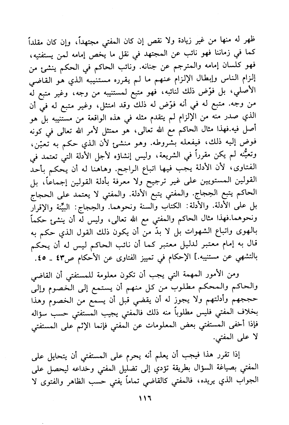 ظهر له منها من غير زيادة ولا نقص إن كان المفتي مجتهداً، وإن كان مقلداً كما في زماننا فهو نائب عن المجتهد في نقل ما يخص إمامه لمن يستفتيه، فهو كلسان إمامه والمترجم عن جنانه. ونائب الحاكم في الحكم ينشئ من إلزام الناس وإبطال الإلزام عنهم ما لم يقرره مستنيبه الذي هو القاضي الأصلي، بل فوّض ذلك لنائبه، فهو متبع لمستنيبه من وجه، وغير متبع له من وجه. متبع له في أنه فوّض له ذلك وقد امتثل، وغير متبع له في أن الذي صدر منه من الإلزام لم يتقدم مثله في هذه الواقعة من مستنيبه بل هو أصل فيه. فهذا مثال الحاكم مع الله تعالى، هو ممتثل لأمر الله تعالى في كونه فوض إليه ذلك، فيفعله بشروطه. وهو منشئ لأن الذي حكم به تعيّن، وتعيُّنه لم يكن مقرراً في الشريعة، وليس إنشاؤه لأجل الأدلة التي تعتمد في الفتاوى، لأن الأدلة يجب فيها اتباع الراجح. وهاهنا له أن يحكم بأحد القولين المستويين على غير ترجيح ولا معرفة بأدلة القولين إجماعاً، بل الحاكم يتبع الحِجاج. والمفتي يتبع الأدلة. والمفتي لا يعتمد على الحجاج بل على الأدلة. والأدلة: الكتاب والسنة ونحوهما. والحِجاج: البيِّنة والإقرار ونحوهما. فهذا مثال الحاكم والمفتي مع الله تعالى، وليس له أن ينشئ حكماً بالهوى واتباع الشهوات بل لا بد من أن يكون ذلك القول الذي حكم به قال به إمام معتبر لدليل معتبر كما أن نائب الحاكم ليس له أن يحكم بالتشهي عن مستنيبه.] الإحكام في تمييز الفتاوى عن الأحكام ص43 - 45.