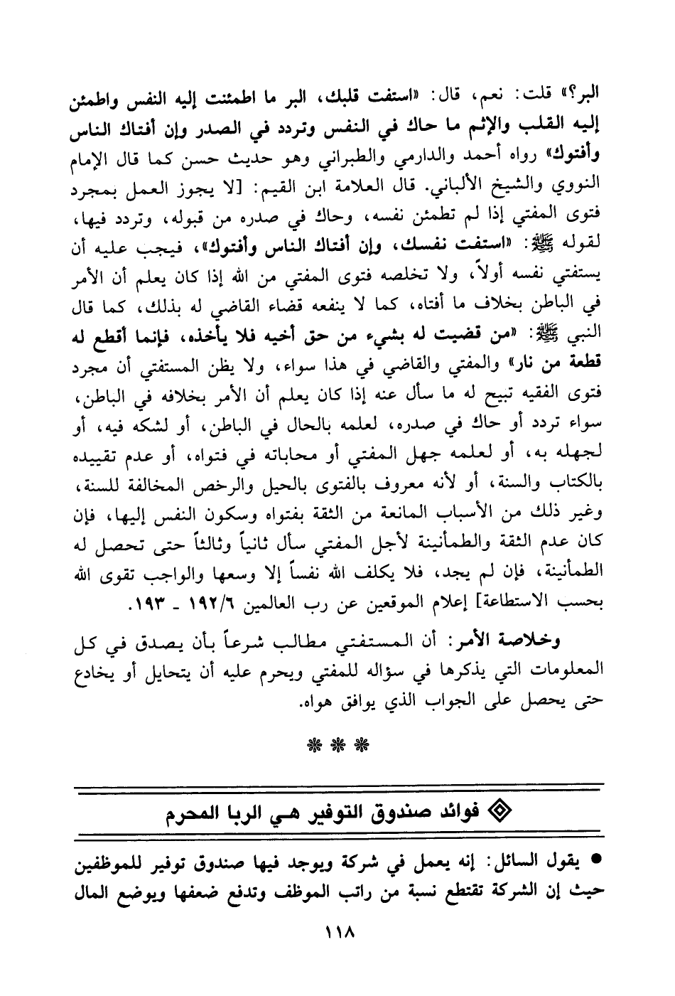البر؟ قلت: نعم، قال: استفت قلبك البر ما اطمئنت إليه النفس واطمئن إليه القلب والإثم ما حاك في النفس وتردد في الصدر وإن أفتاك الناس وأفتوك) رواه أحمد والدارمي والطبراني وهو حديث حسن كما قال الإمام النووي والشيخ الألباني. قال العلامة ابن القيم: [لا يجوز العمل بمجرد فتوى المفتي إذا لم تطمئن نفسه، وحاك في صدره من قبوله، وتردد فيها، لقوله - صَلَّى اللهُ عَلَيْهِ وَسَلَّمَ -: (استفت نفسك، وإن أفتاك الناس وأفتوك)، فيجب عليه أن يستفتي نفسه أولاً، ولا تخلصه فتوى المفتي من الله إذا كان يعلم أن الأمر في الباطن بخلاف ما أفتاه، كما لا ينفعه قضاء القاضي له بذلك، كما قال النبي - صَلَّى اللهُ عَلَيْهِ وَسَلَّمَ -: (من قضيت له بشيء من حق أخيه فلا يأخذه، فإنما أقطع له قطعة من نار) والمفتي والقاضي في هذا سواء، ولا يظن المستفتي أن مجرد فتوى الفقيه تبيح له ما سأل عنه إذا كان يعلم أن الأمر بخلافه في الباطن، سواء تردد أو حاك في صدره، لعلمه بالحال في الباطن، أو لشكه فيه، أو لجهله به، أو لعلمه جهل المفتي أو محاباته في فتواه، أو عدم تقييده بالكتاب والسنة، أو لأنه معروف بالفتوى بالحيل والرخص المخالفة للسنة، وغير ذلك من الأسباب المانعة من الثقة بفتواه وسكون النفس إليها، فإن كان عدم الثقة والطمأنينة لأجل المفتي سأل ثانياً وثالثاً حتى تحصل له الطمأنينة، فإن لم يجد، فلا يكلف الله نفساً إلا وسعها والواجب تقوى الله بحسب الاستطاعة] إعلام الموقعين عن رب العالمين 6/ 192 - 193.