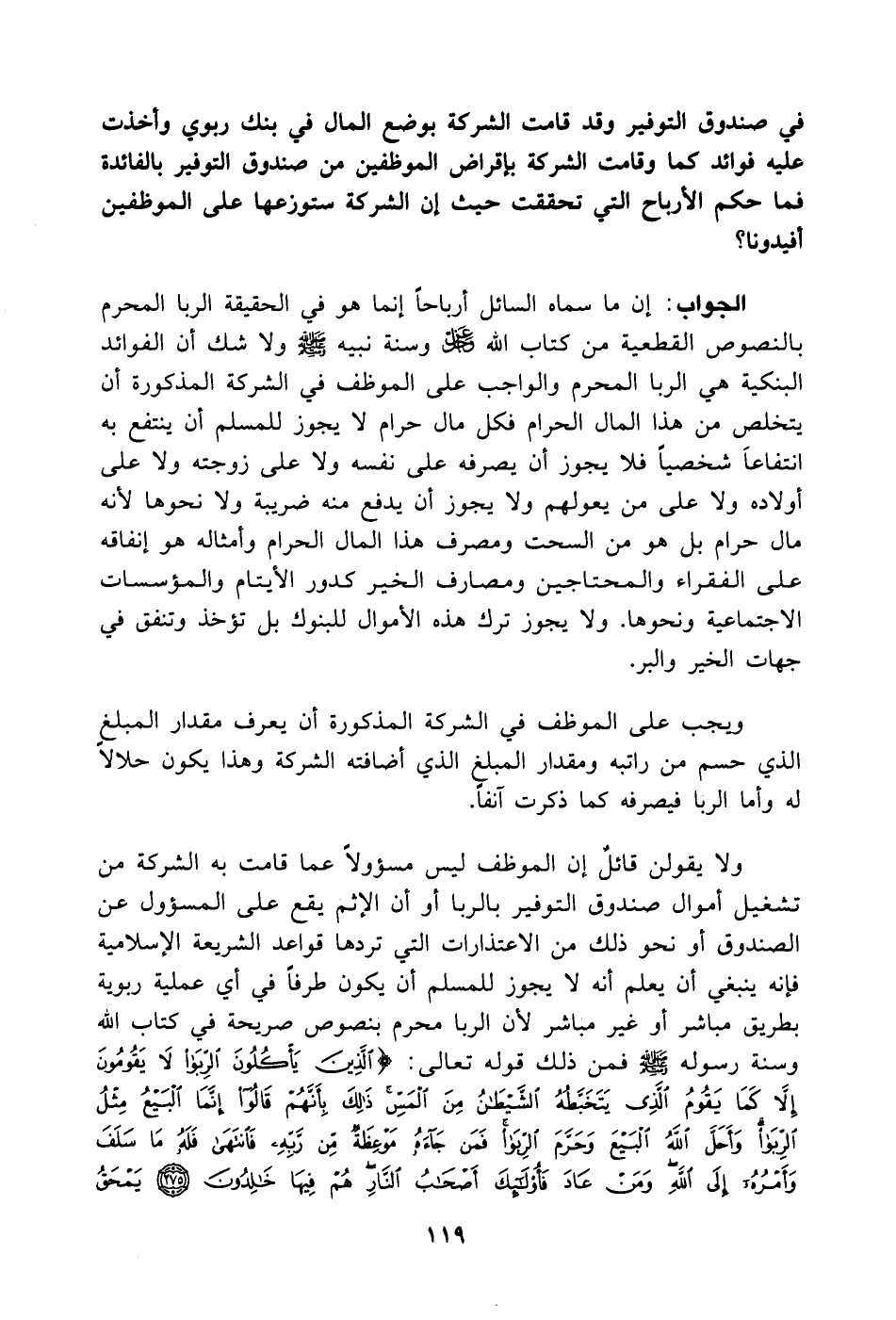 ولا يقولن قائلٌ إن الموظف ليس مسئولاً عما قامت به الشركة من تشغيل أموال صندوق التوفير بالربا أو أن الإثم يقع على المسؤول عن الصندوق أو نحو ذلك من الاعتذارات التي تردها قواعد الشريعة الإسلامية فإنه ينبغي أن يعلم أنه لا يجوز للمسلم أن يكون طرفاً في أي عملية ربوية بطريق مباشر أو غير مباشر لأن الربا محرم بنصوص صريحة في كتاب الله وسنة رسوله - صَلَّى اللهُ عَلَيْهِ وَسَلَّمَ - فمن ذلك قوله تعالى: {الَّذِينَ يَأْكُلُونَ الرِّبَا لا يَقُومُونَ إِلاّ كَمَا يَقُومُ الَّذِي يَتَخَبَّطُهُ الشَّيْطَانُ مِنْ الْمَسِّ ذَلِكَ بِأَنَّهُمْ قَالُوا إِنَّمَا الْبَيْعُ مِثْلُ الرِّبَا وَأَحَلَّ اللَّهُ الْبَيْعَ وَحَرَّمَ الرِّبَا فَمَنْ جَاءَهُ مَوْعِظَةٌ مِنْ رَبِّهِ فَانتَهَى فَلَهُ مَا سَلَفَ وَأَمْرُهُ إِلَى اللَّهِ وَمَنْ عَادَ فَأُوْلَئِكَ أَصْحَابُ النَّارِ هُمْ فِيهَا خَالِدُونَ يَمْحَقُ
