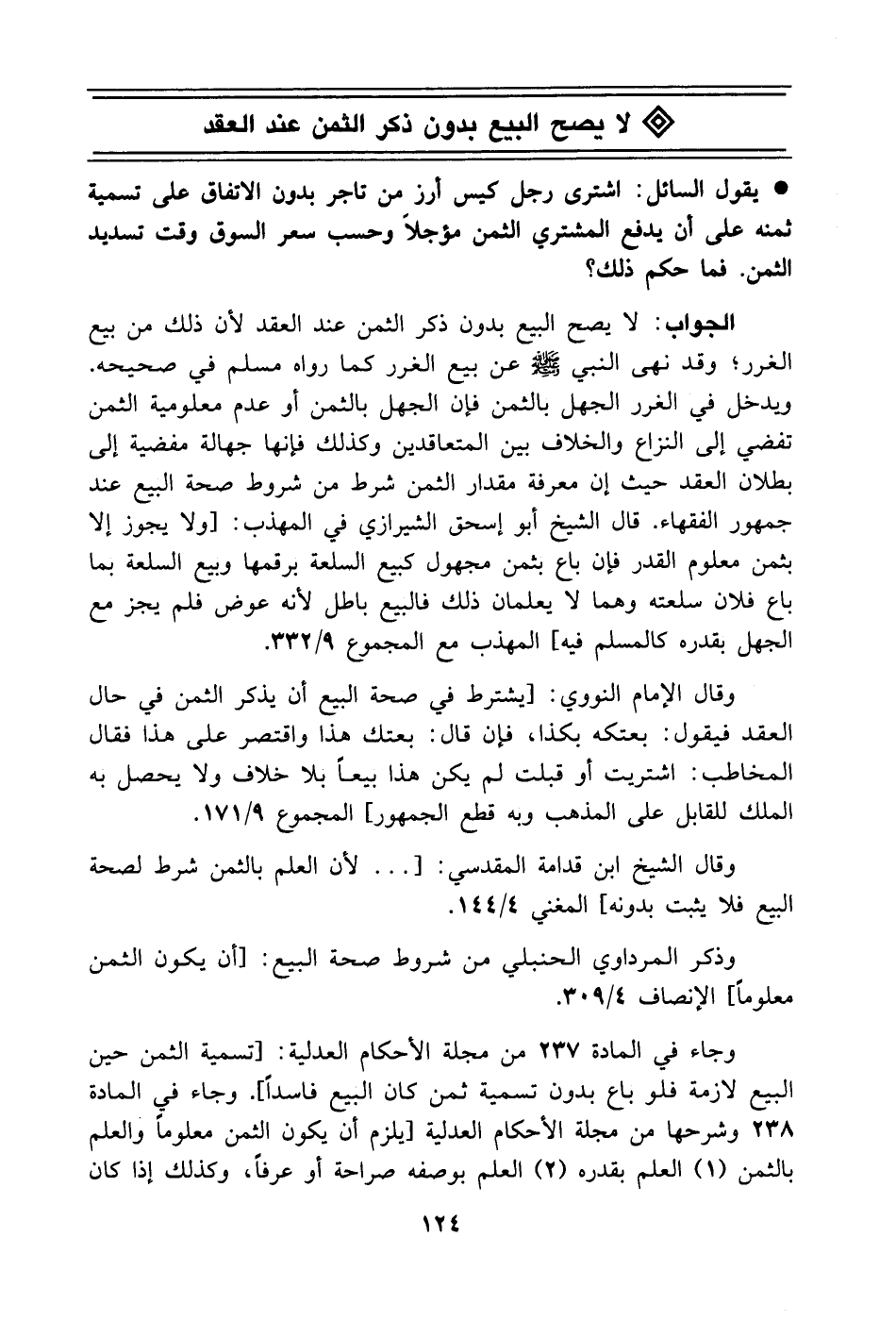 وجاء في المادة 237 من مجلة الأحكام العدلية: [تسمية الثمن حين البيع لازمة فلو باع بدون تسمية ثمن كان البيع فاسداً]. وجاء في المادة 238 وشرحها من مجلة الأحكام العدلية [يلزم أن يكون الثمن معلوماً والعلم بالثمن (1) العلم بقدره (2) العلم بوصفه صراحة أو عرفاً، وكذلك إذا كان