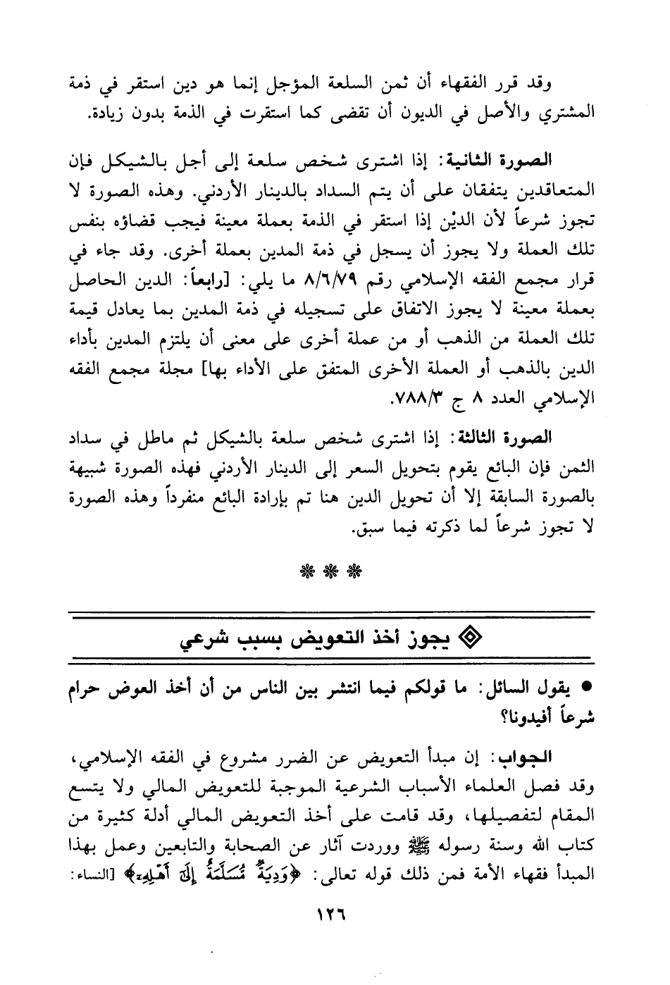 الصورة الثانية: إذا اشترى شخص سلعة إلى أجل بالشيكل فإن المتعاقدين يتفقان على أن يتم السداد بالدينار الأردني. وهذه الصورة لا تجوز شرعاً لأن الديْن إذا استقر في الذمة بعملة معينة فيجب قضاؤه بنفس تلك العملة ولا يجوز أن يسجل في ذمة المدين بعملة أخرى. وقد جاء في قرار مجمع الفقه الإسلامي رقم 79/ 6/8 ما يلي: [رابعاً: الدين الحاصل بعملة معينة لا يجوز الاتفاق على تسجيله في ذمة المدين بما يعادل قيمة تلك العملة من الذهب أو من عملة أخرى على معنى أن يلتزم المدين بأداء الدين بالذهب أو العملة الأخرى المتفق على الأداء بها] مجلة مجمع الفقه الإسلامي العدد 8 ج 3/ 788.