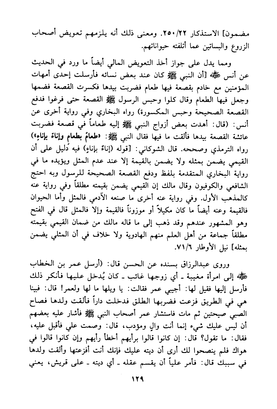 ومما يدل على جواز أخذ التعويض المالي أيضاً ما ورد في الحديث عن أنس - رضي الله عنه - أن النبي - صَلَّى اللهُ عَلَيْهِ وَسَلَّمَ - كان عند بعض نسائه فأرسلت إحدى أمهات المؤمنين مع خادم بقصعة فيها طعام فضربت بيدها فكسرت القصعة فضمها وجعل فيها الطعام وقال كلوا وحبس الرسول - صَلَّى اللهُ عَلَيْهِ وَسَلَّمَ - القصعة حتى فرغوا فدفع القصعة الصحيحة وحبس المكسورة) رواه البخاري وفي رواية أخرى عن أنس: (قال أهدت بعض أزواج النبي - صَلَّى اللهُ عَلَيْهِ وَسَلَّمَ - إليه طعاماً في قصعة فضربت عائشة القصعة بيدها فألقت ما فيها فقال النبي - صَلَّى اللهُ عَلَيْهِ وَسَلَّمَ - طعامٌ بطعامٍ وإناءٌ بإناءٍ) رواه الترمذي وصححه. قال الشوكاني: [قوله (إناءٌ بإناءٍ) فيه دليل على أن القيمي يضمن بمثله ولا يضمن بالقيمة إلا عند عدم المثل ويؤيده ما في رواية البخاري المتقدمة بلفظ ودفع القصعة الصحيحة للرسول وبه احتج الشافعي والكوفيون وقال مالك إن القيمي يضمن بقيمته مطلقاً وفي رواية عنه كالمذهب الأول. وفي رواية عنه أخرى ما صنعه الآدمي فالمثل وأما الحيوان فالقيمة وعنه أيضا ما كان مكيلاً أو موزوناً فالقيمة وإلا فالمثل قال في الفتح وهو المشهور عندهم وقد ذهب إلى ما قاله مالك من ضمان القيمي بقيمته مطلقاً جماعة من أهل العلم منهم الهادوية ولا خلاف في أن المثلي يضمن بمثله] نيل الأوطار 6/ 71.