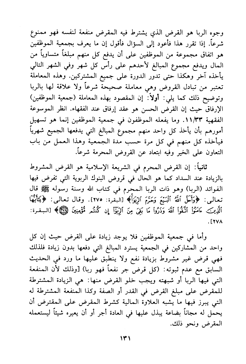وأما في جمعية الموظفين فلا يوجد زيادة على القرض حيث إن كل واحد من المشاركين في الجمعية يسترد المبالغ التي دفعها بدون زيادة فلذلك فهي قرض غير مشروط بزيادة نفع ولا ينطبق عليها ما ورد في الحديث السابق مع عدم ثبوته: (كل قرض جر نفعاً فهو ربا) [وذلك لأن المنفعة التي فيها الربا أو شبهته ويجب خلو القرض منها: هي الزيادة المشترطة للمقرض على مبلغ القرض في القدر أو الصفة وكذا المنفعة المشترطة له التي يبرز فيها ما يشبه العلاوة المالية كشرط المقرض على المقترض أن يحمل له مجاناً بضاعة يبذل عليها في العادة أجر أو أن يعيره شيئاً ليستعمله المقرض ونحو ذلك.