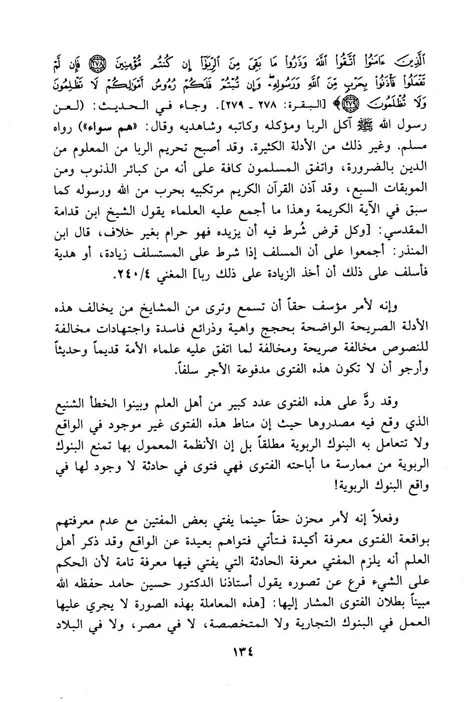 الَّذِينَءَامَنُوا اتَّقُوا اللَّهَ وَذَرُوا مَا بَقِيَ مِنَ الرِّبَا إِنْ كُنْتُمْ مُؤْمِنِينَ فَإِنْ لَمْ تَفْعَلُوا فَأْذَنُوا بِحَرْبٍ مِنَ اللَّهِ وَرَسُولِهِ وَإِنْ تُبْتُمْ فَلَكُمْ رُءُوسُ أَمْوَالِكُمْ لَا تَظْلِمُونَ وَلَا تُظْلَمُونَ} سورة البقرة الآيتان 278 - 279. وجاء في الحديث: (لعن رسول الله - صَلَّى اللهُ عَلَيْهِ وَسَلَّمَ - آكل الربا ومؤكله وكاتبه وشاهديه وقال: هم سواء) رواه مسلم. وغير ذلك من الأدلة الكثيرة. وقد أصبح تحريم الربا من المعلوم من الدين بالضرورة، واتفق المسلمون كافة على أنه من كبائر الذنوب ومن الموبقات السبع، وقد آذن القرآن الكريم مرتكبيه بحرب من الله ورسوله كما سبق في الآية الكريمة وهذا ما أجمع عليه العلماء يقول الشيخ ابن قدامة المقدسي: [وكل قرض شُرط فيه أن يزيده فهو حرام بغير خلاف، قال ابن المنذر: أجمعوا على أن المسلف إذا شرط على المستسلف زيادة، أو هدية فأسلف على ذلك أن أخذ الزيادة على ذلك ربا) المغني 4/ 240.