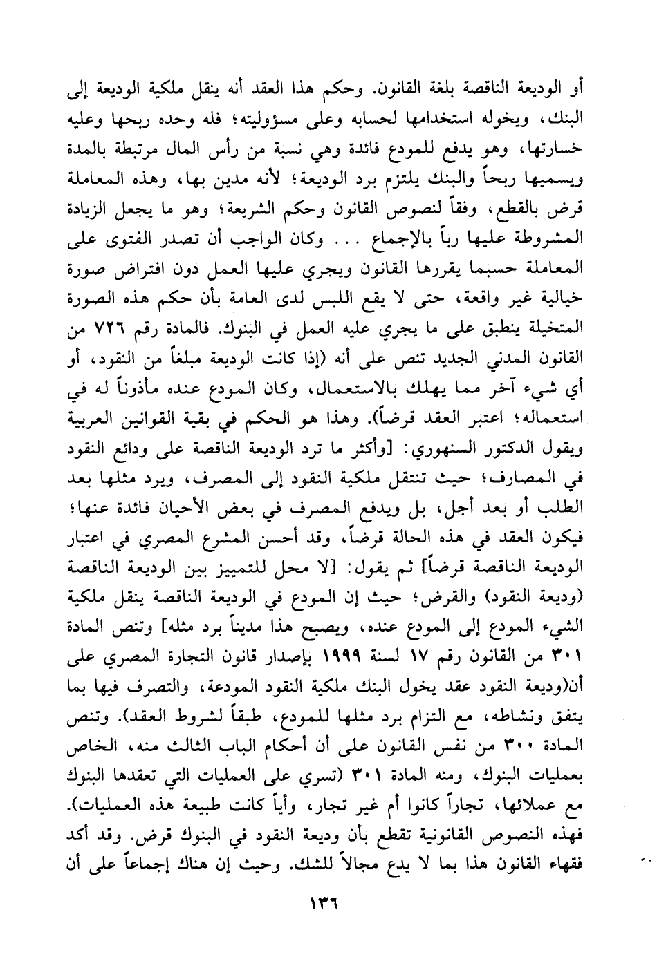 مثله] وتنص المادة 301 من القانون رقم 17 لسنة 1999 بإصدار قانون التجارة المصري على أن (وديعة النقود عقد يخول البنك ملكية النقود المودعة، والتصرف فيها بما يتفق ونشاطه، مع التزام برد مثلها للمودع، طبقاً لشروط العقد). وتنص المادة 300 من نفس القانون على أن أحكام الباب الثالث منه، الخاص بعمليات البنوك، ومنه المادة 301 (تسري على العمليات التي تعقدها البنوك مع عملائها، تجاراً كانوا أم غير تجار، وأياً كانت طبيعة هذه العمليات). فهذه النصوص القانونية تقطع بأن وديعة النقود في البنوك قرض. وقد أكد فقهاء القانون هذا بما لا يدع مجالاً للشك. وحيث إن هناك إجماعاً على أن