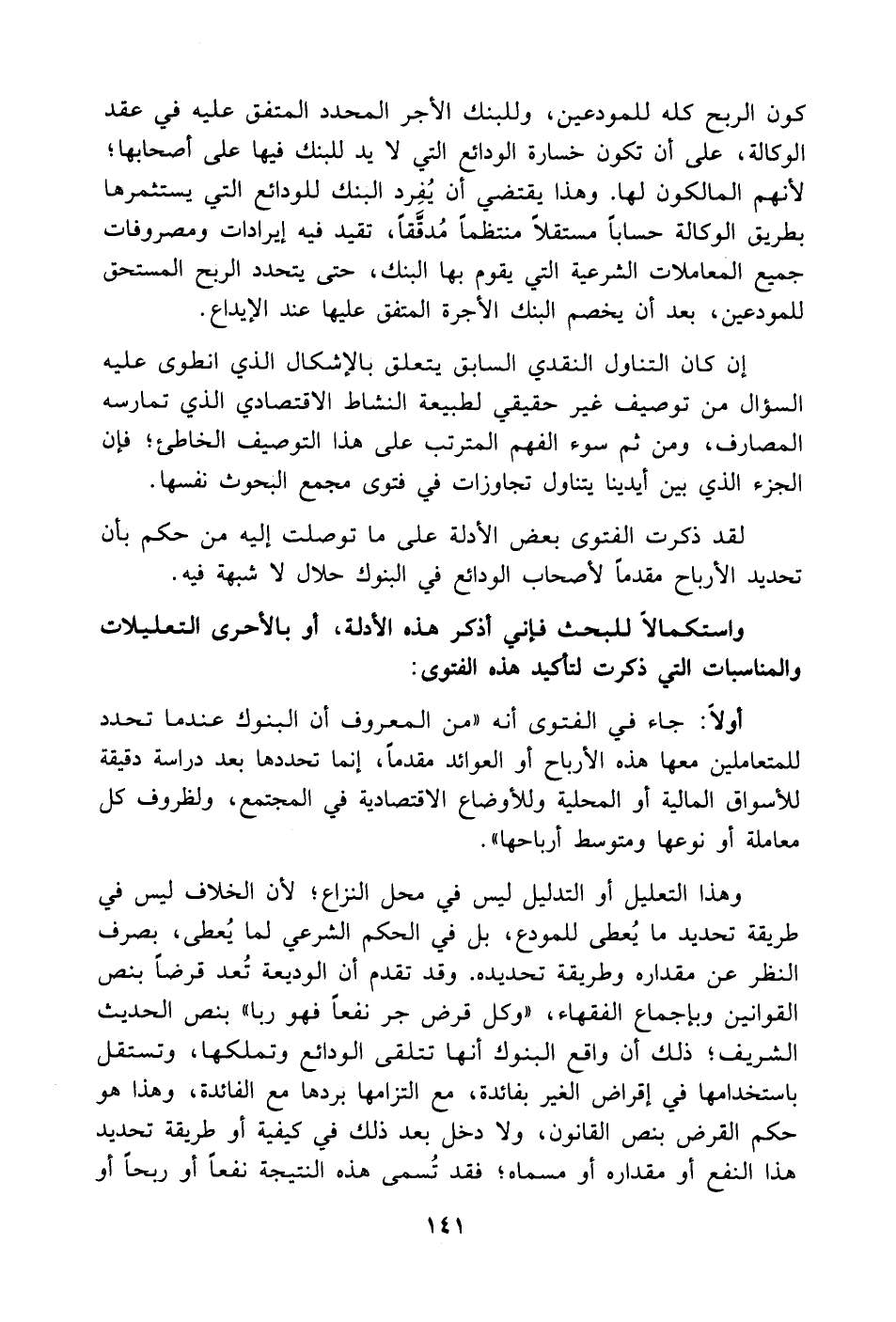 لقد ذكرت الفتوى بعض الأدلة على ما توصلت إليه من حكم بأن تحديد الأرباح مقدماً لأصحاب الودائع في البنوك حلال لا شبهة فيه. واستكمالاً للبحث فإني أذكر هذه الأدلة، أو بالأحرى التعليلات والمناسبات التي ذكرت لتأكيد هذه الفتوى: