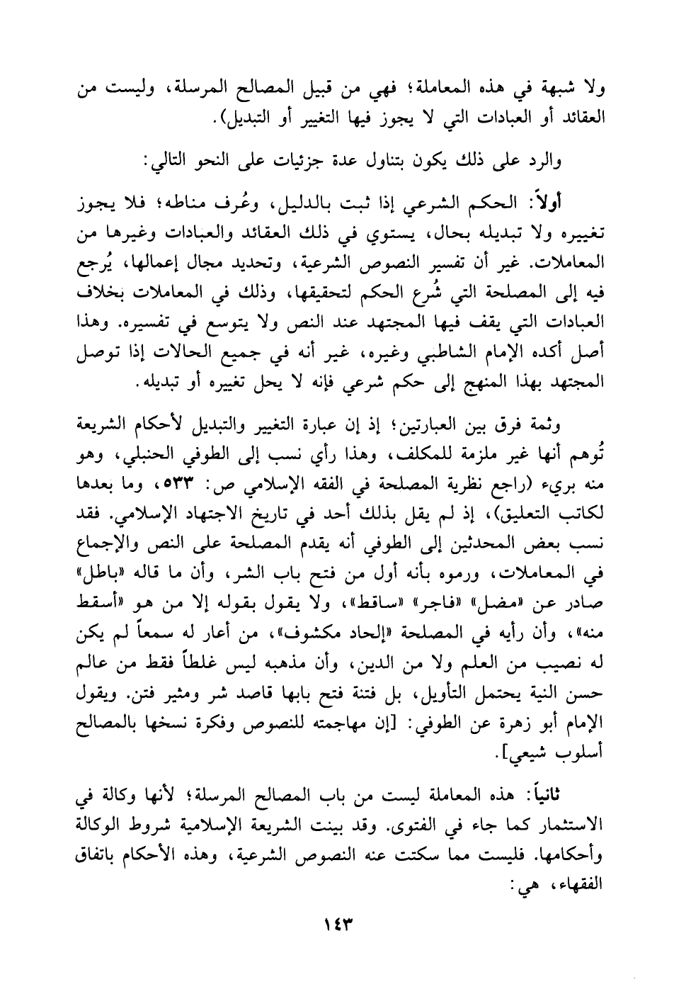 وثمة فرق بين العبارتين؛ إذ إن عبارة التغيير والتبديل لأحكام الشريعة تُوهم أنها غير ملزمة للمكلف، وهذا رأي نسب إلى الطوفي الحنبلي، وهو منه بريء (راجع نظرية المصلحة في الفقه الإسلامي ص: 533، وما بعدها لكاتب التعليق)، إذ لم يقل بذلك أحد في تاريخ الاجتهاد الإسلامي. فقد نسب بعض المحدثين إلى الطوفي أنه يقدم المصلحة على النص والإجماع في المعاملات، ورموه بأنه أول من فتح باب الشر، وأن ما قاله "باطل" صادر عن "مضل" "فاجر" "ساقط"، ولا يقول بقوله إلا من هو "أسقط منه"، وأن رأيه في المصلحة "إلحاد مكشوف"، من أعار له سمعاً لم يكن له نصيب من العلم ولا من الدين، وأن مذهبه ليس غلطاً فقط من عالم حسن النية يحتمل التأويل، بل فتنة فتح بابها قاصد شر ومثير فتن. ويقول الإمام أبو زهرة عن الطوفي: [إن مهاجمته للنصوص وفكرة نسخها بالمصالح أسلوب شيعي].