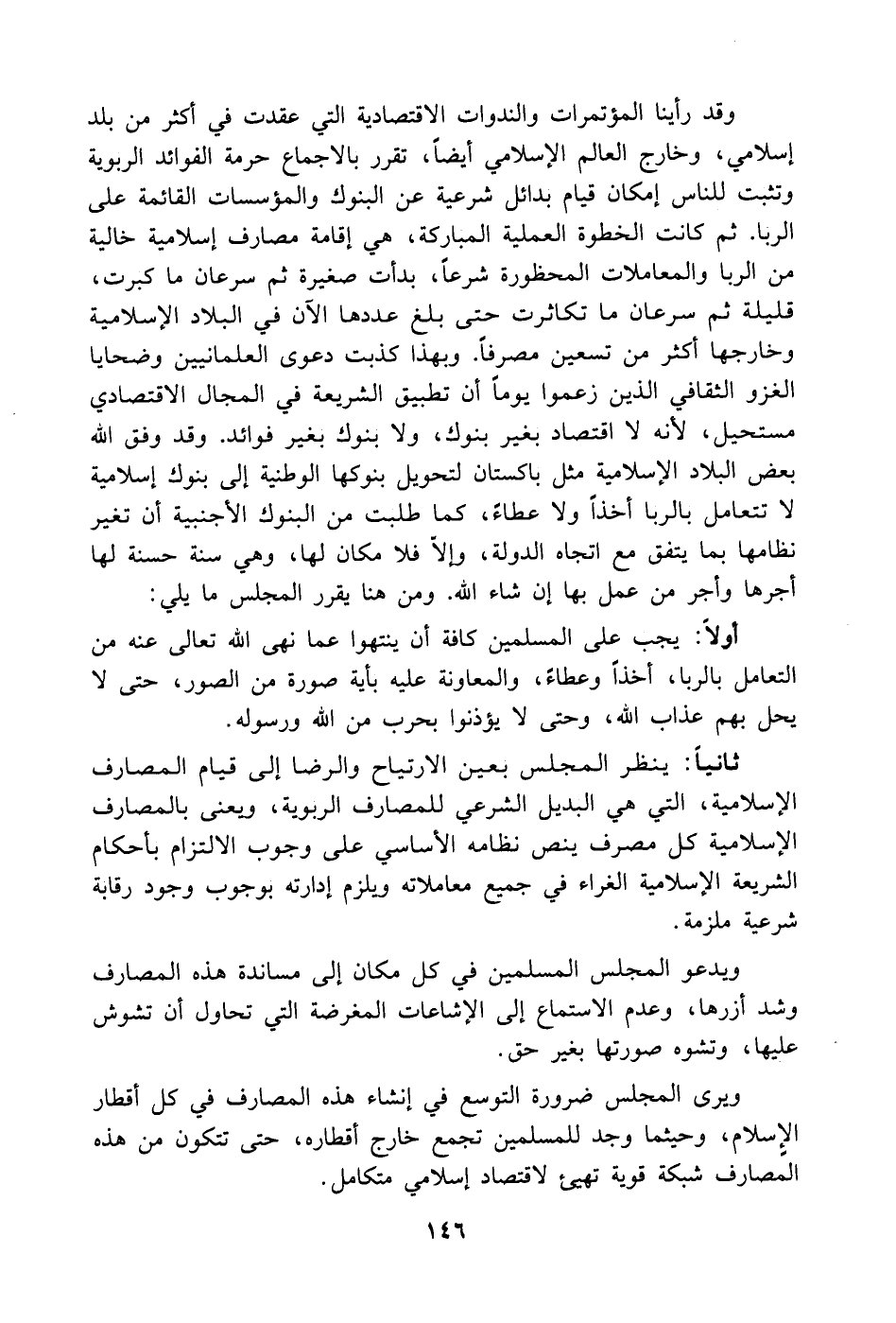 وقد رأينا المؤتمرات والندوات الاقتصادية التي عقدت في أكثر من بلد إسلامي، وخارج العالم الإسلامي أيضاً، تقرر بالاجماع حرمة الفوائد الربوية وتثبت للناس إمكان قيام بدائل شرعية عن البنوك والمؤسسات القائمة على الربا. ثم كانت الخطوة العملية المباركة، هي إقامة مصارف إسلامية خالية من الربا والمعاملات المحظورة شرعاً، بدأت صغيرة ثم سرعان ما كبرت، قليلة ثم سرعان ما تكاثرت حتى بلغ عددها الآن في البلاد الإسلامية وخارجها أكثر من تسعين مصرفاً. وبهذا كذبت دعوى العلمانيين وضحايا الغزو الثقافي الذين زعموا يوماً أن تطبيق الشريعة في المجال الاقتصادي مستحيل، لأنه لا اقتصاد بغير بنوك، ولا بنوك بغير فوائد. وقد وفق الله بعض البلاد الإسلامية مثل باكستان لتحويل بنوكها الوطنية إلى بنوك إسلامية لا تتعامل بالربا أخذاً ولا عطاءً، كما طلبت من البنوك الأجنبية أن تغير نظامها بما يتفق مع اتجاه الدولة، وإلاّ فلا مكان لها، وهي سنة حسنة لها أجرها وأجر من عمل بها إن شاء الله. ومن هنا يقرر المجلس ما يلي: