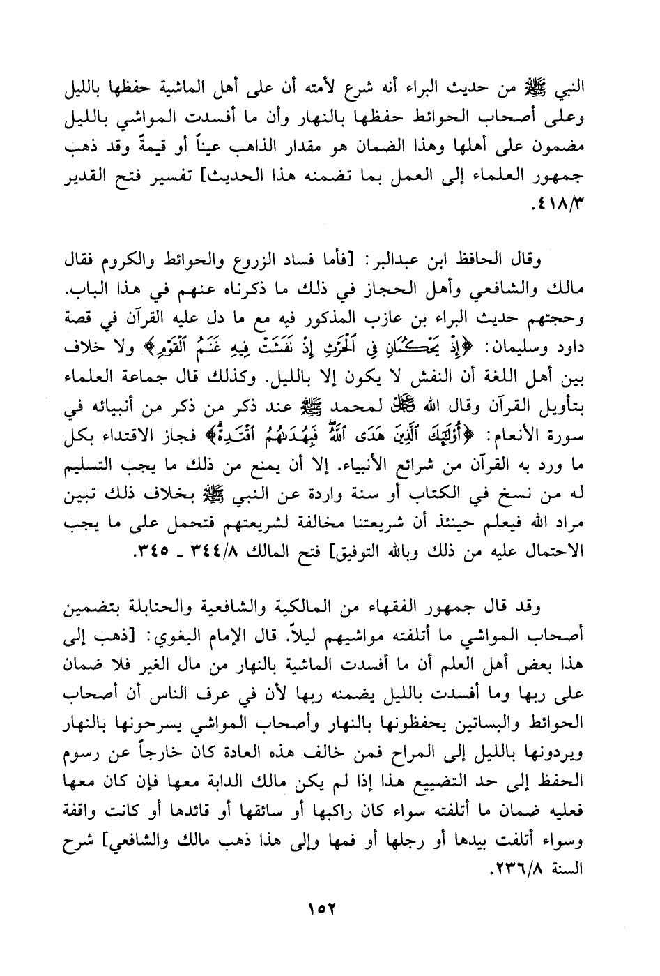 وقال الحافظ ابن عبد البر: [فأما فساد الزروع والحوائط والكروم فقال مالك والشافعي وأهل الحجاز في ذلك ما ذكرناه عنهم في هذا الباب. وحجتهم حديث البراء بن عازب المذكور فيه مع ما دل عليه القرآن في قصة داود وسليمان: {إِذْ يَحْكُمَانِ فِي الْحَرْثِ إِذْ نَفَشَتْ فِيهِ غَنَمُ الْقَوْمِ} ولا خلاف بين أهل اللغة أن النفش لا يكون إلا بالليل. وكذلك قال جماعة العلماء بتأويل القرآن وقال الله عز وجل لمحمد - صَلَّى اللهُ عَلَيْهِ وَسَلَّمَ - عند ذكر من ذكر من أنبيائه في سورة الأنعام: {أُولَئِكَ الَّذِينَ هَدَى اللَّهُ فَبِهُدَاهُمُ اقْتَدِهِ} فجاز الإقتداء بكل ما ورد به القرآن من شرائع الأنبياء. إلا أن يمنع من ذلك ما يجب التسليم له من نسخ في الكتاب أو سنة واردة عن النبي - صَلَّى اللهُ عَلَيْهِ وَسَلَّمَ - بخلاف ذلك تبين مراد الله فيعلم حينئذ أن شريعتنا مخالفة لشريعتهم فتحمل على ما يجب الاحتمال عليه من ذلك وبالله التوفيق] فتح المالك 8/ 344 - 345.