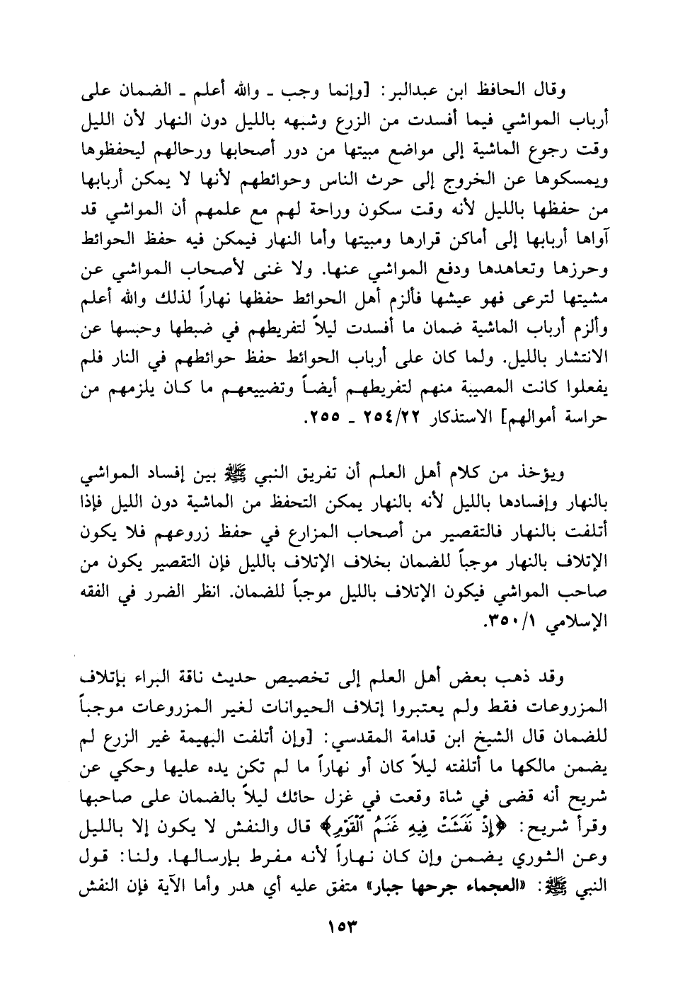 وقال الحافظ ابن عبد البر: [وإنما وجب - والله أعلم - الضمان على أرباب المواشي فيما أفسدت من الزرع وشبهه بالليل دون النهار لأن الليل وقت رجوع الماشية إلى مواضع مبيتها من دور أصحابها ورحالهم ليحفظوها ويمسكوها عن الخروج إلى حرث الناس وحوائطهم لأنها لا يمكن أربابها من حفظها بالليل لأنه وقت سكون وراحة لهم مع علمهم أن المواشي قد آواها أربابها إلى أماكن قرارها ومبيتها وأما النهار فيمكن فيه حفظ الحوائط وحرزها وتعاهدها ودفع المواشي عنها. ولا غنى لأصحاب المواشي عن مشيتها لترعى فهو عيشها فألزم أهل الحوائط حفظها نهاراً لذلك والله أعلم وألزم أرباب الماشية ضمان ما أفسدت ليلاً لتفريطهم في ضبطها وحبسها عن الانتشار بالليل. ولما كان على أرباب الحوائط حفظ حوائطهم في النار فلم يفعلوا كانت المصيبة منهم لتفريطهم أيضاً وتضييعهم ما كان يلزمهم من حراسة أموالهم] الاستذكار 22/ 254 - 255.