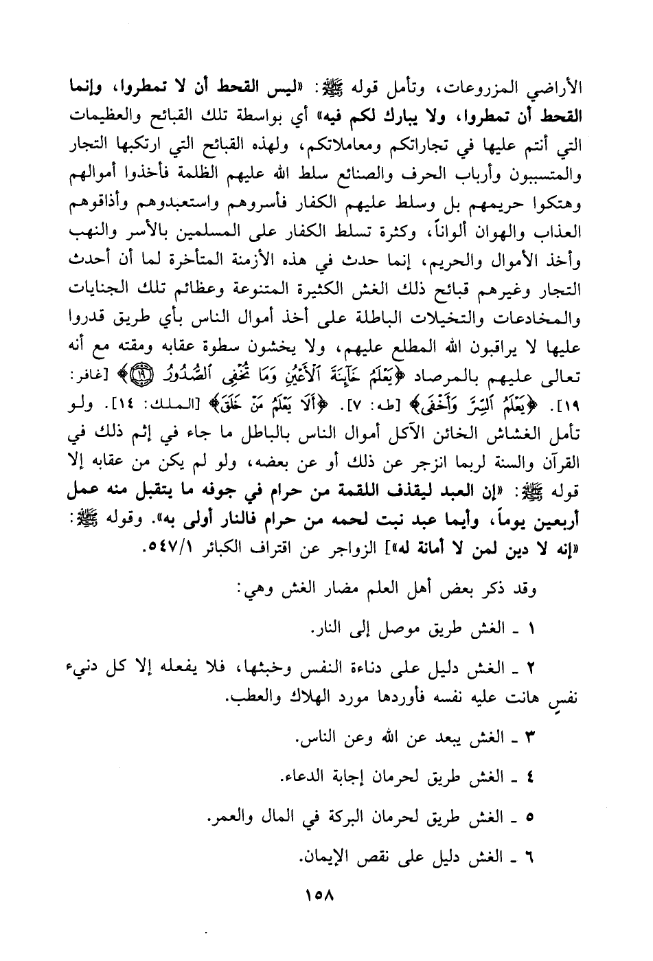 الأراضي المزروعات، وتأمل قوله - صَلَّى اللهُ عَلَيْهِ وَسَلَّمَ -: (ليس القحط أن لا تمطروا، وإنما القحط أن تمطروا، ولا يبارك لكم فيه) أي بواسطة تلك القبائح والعظيمات التي أنتم عليها في تجاراتكم ومعاملاتكم، ولهذه القبائح التي ارتكبها التجار والمتسببون وأرباب الحرف والصنائع سلط الله عليهم الظلمة فأخذوا أموالهم وهتكوا حريمهم بل وسلط عليهم الكفار فأسروهم واستعبدوهم وأذاقوهم العذاب والهوان ألواناً، وكثرة تسلط الكفار على المسلمين بالأسر والنهب وأخذ الأموال والحريم، إنما حدث في هذه الأزمنة المتأخرة لما أن أحدث التجار وغيرهم قبائح ذلك الغش الكثيرة المتنوعة وعظائم تلك الجنايات والمخادعات والتخيلات الباطلة على أخذ أموال الناس بأي طريق قدروا عليها لا يراقبون الله المطلع عليهم، ولا يخشون سطوة عقابه ومقته مع أنه تعالى عليهم بالمرصاد {يَعْلَمُ خَائِنَةَ الْأَعْيُنِ وَمَا تُخْفِي الصُّدُورُ} سورة غافر الآية 19. {يَعْلَمُ السِّرَّ وَأَخْفَى} سورة طه الآية 7. {أَلاَ يَعْلَمُ مَنْ خَلَقَ} سورة الملك الآية 14. ولو تأمل الغشاش الخائن الآكل أموال الناس بالباطل ما جاء في إثم ذلك في القرآن والسنة لربما انزجر عن ذلك أو عن بعضه، ولو لم يكن من عقابه إلا قوله - صَلَّى اللهُ عَلَيْهِ وَسَلَّمَ -: (إن العبد ليقذف اللقمة من حرام في جوفه ما يتقبل منه عمل أربعين يوماً، وأيما عبد نبت لحمه من حرام فالنار أولى به). وقوله - صَلَّى اللهُ عَلَيْهِ وَسَلَّمَ -: (إنه لا دين لمن لا أمانة له)] الزواجر عن اقتراف الكبائر 1/ 547.