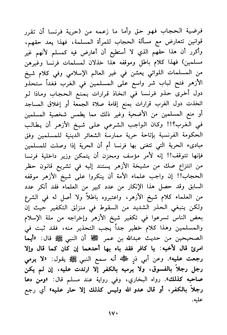 فرضية الحجاب فهو حق وأما ما زعمه من (حرية فرنسا أن تقرر قوانين تتعارض مع مسألة الحجاب للمرأة المسلمة، فهذا يعد حقهم، وأكرر أن هذا حقهم الذي لا أستطيع أن أعارض فيه كمسلم لأنهم غير مسلمين) فهذا كلام باطل وموقفه هذا خذلان لمسلمات فرنسا وغيرهن من المسلمات اللواتي يعشن في غير العالم الإسلامي وفي كلام شيخ الأزهر فتح لباب شر واسع على المسلمين في الغرب فغداً ستحذو دول أخرى حذو فرنسا في اتخاذ قرارات بمنع الحجاب وماذا لو اتخذت دول الغرب قرارات بمنع إقامة صلاة الجمعة أو إغلاق المساجد أو منع المسلمين من الأضحية وغير ذلك مما يطمس شخصية المسلمين في الغرب؟!! وكان الواجب الشرعي على شيخ الأزهر أن يطالب الحكومة الفرنسية بإتاحة حرية ممارسة الشعائر الدينية للمسلمين وفق مبادىء الحرية التي تتغنى بها فرنسا أم أن الحرية إذا وصلت للمسلمين فإنها تتوقف!! إنه لأمر مؤسف ومحزن أن يتمكن وزير داخلية فرنسا من انتزاع صك من مشيخة الأزهر يستند إليه في تشريع قانون حظر الحجاب!! إن واجب علماء الأمة أن ينكروا على شيخ الأزهر موقفه السابق وقد حصل هذا الإنكار من عدد كبير من العلماء فقد أنكر عدد من العلماء كلام شيخ الأزهر، واعتبروه باطلاً ولا أصل له في الشرع ولكن ينبغي الحذر الشديد من السقوط في منزلق التكفير حيث إن بعض الناس تسرعوا في تكفير شيخ الأزهر وإخراجه من ملة الإسلام والمسلمين وهذا كلام خطير جداً يجب التحذير منه، فقد ثبت في الصحيحين من حديث عبد الله بن عمر رضي الله عنهما أن النبي - صَلَّى اللهُ عَلَيْهِ وَسَلَّمَ - قال: (أيما امرئ قال لأخيه: يا كافر فقد باء بها أحدهما إن كان كما قال وإلا رجعت عليه). وعن أبي ذرٍ - رضي الله عنه -أنه سمع النبي - صَلَّى اللهُ عَلَيْهِ وَسَلَّمَ - يقول: (لا يرمي رجل رجلاً بالفسوق، ولا يرميه بالكفر إلا ارتدت عليه، إن لم يكن صاحبه كذلك). رواه البخاري،