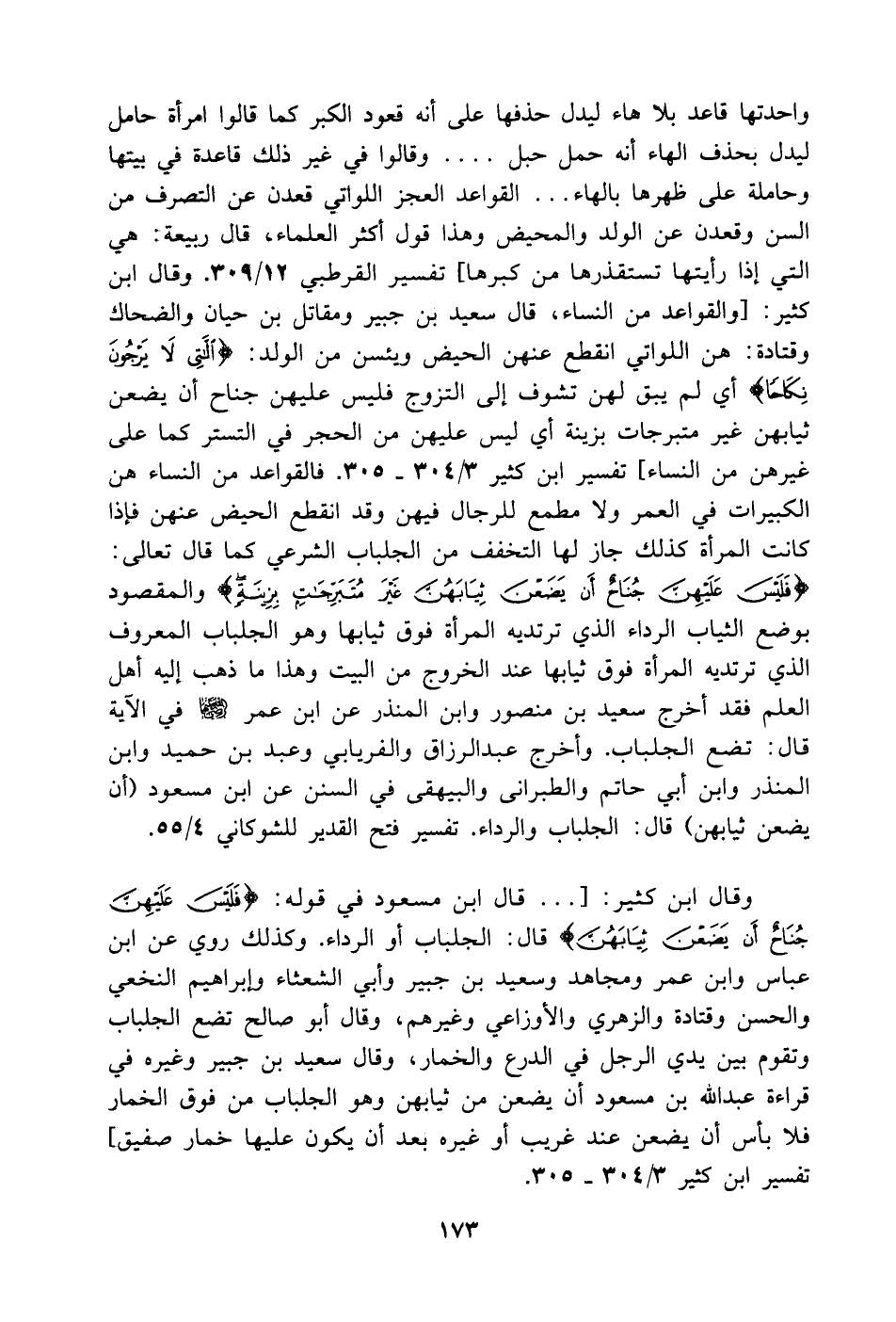 وقال ابن كثير: [. قال ابن مسعود في قوله: {فَلَيْسَ عَلَيْهِنَّ جُنَاحٌ أَنْ يَضَعْنَ ثِيَابَهُنَّ} قال: الجلباب أو الرداء. وكذلك روي عن ابن عباس وابن عمر ومجاهد وسعيد بن جبير وأبي الشعثاء وإبراهيم النخعي والحسن وقتادة والزهري والأوزاعي وغيرهم، وقال
