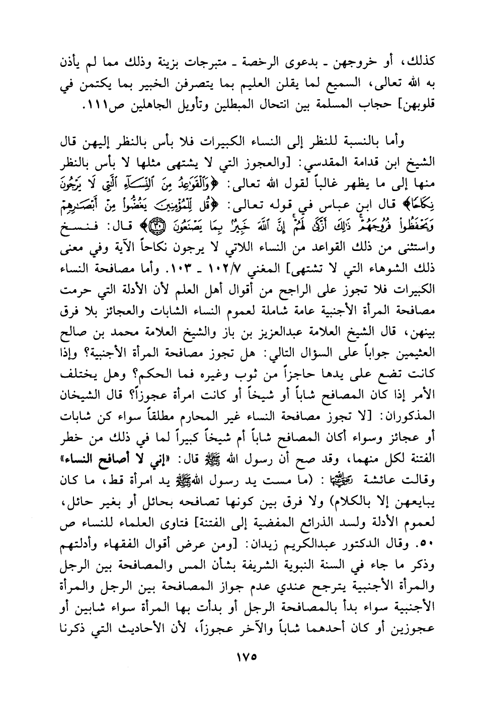 وأما بالنسبة للنظر إلى النساء الكبيرات فلا بأس بالنظر إليهن قال الشيخ ابن قدامة المقدسي: [والعجوز التي لا يشتهى مثلها لا بأس بالنظر منها إلى ما يظهر غالباً لقول الله تعالى: {وَالْقَوَاعِدُ مِنَ النِّسَاءِ اللاتِي لا يَرْجُونَ نِكَاحًا} قال ابن عباس في قوله تعالى: {قُلْ لِلْمُؤْمِنِينَ يَغُضُّوا مِنْ أَبْصَارِهِمْ. وَقُلْ لِلْمُؤْمِنَاتِ يَغْضُضْنَ مِنْ أَبْصَارِهِنَّ} قال: فنسخ واستثنى من ذلك القواعد من النساء اللاتي لا يرجون نكاحاً الآية وفي معنى ذلك الشوهاء التي لا تشتهى] المغني 7/ 102 - 103. وأما مصافحة النساء الكبيرات فلا تجوز على الراجح من أقوال أهل العلم لأن الأدلة التي حرمت مصافحة المرأة الأجنبية عامة شاملة لعموم النساء الشابات والعجائز بلا فرق بينهن، قال الشيخ العلامة عبد العزيز بن باز والشيخ العلامة محمد بن صالح العثيمين جواباً على السؤال التالي: هل تجوز مصافحة المرأة الأجنبية؟ وإذا كانت تضع على يدها حاجزاً من ثوب وغيره فما الحكم؟ وهل يختلف الأمر إذا كان المصافح شاباً أو شيخاً أو كانت امرأة عجوزاً؟ قال الشيخان المذكوران: [لا تجوز مصافحة النساء غير المحارم مطلقاً سواء كن شابات أو عجائز وسواء أكان المصافح شاباً أم شيخاً كبيراً لما في ذلك من خطر الفتنة لكل منهما، وقد صح أن رسول الله - صَلَّى اللهُ عَلَيْهِ وَسَلَّمَ - قال: (إني لا أصافح النساء) وقالت عائشة رضي الله عنها (ما مست يد رسول الله- صَلَّى اللهُ عَلَيْهِ وَسَلَّمَ - يد امرأة قط، ما كان يبايعهن إلا بالكلام] ولا فرق بين كونها تصافحه بحائل أو بغير حائل، لعموم الأدلة ولسد الذرائع المفضية إلى الفتنة] فتاوى العلماء للنساء ص 50. وقال الدكتور عبد الكريم زيدان: [ومن عرض أقوال الفقهاء وأدلتهم وذكر ما جاء في السنة النبوية الشريفة بشأن المس والمصافحة بين الرجل والمرأة الأجنبية يترجح عندي عدم جواز المصافحة بين الرجل والمرأة الأجنبية سواء بدأ بالمصافحة الرجل أو بدأت بها المرأة سواء شابين أو عجوزين أو كان أحدهما شاباً والآخر عجوزاً، لأن الأحاديث التي ذكرنا