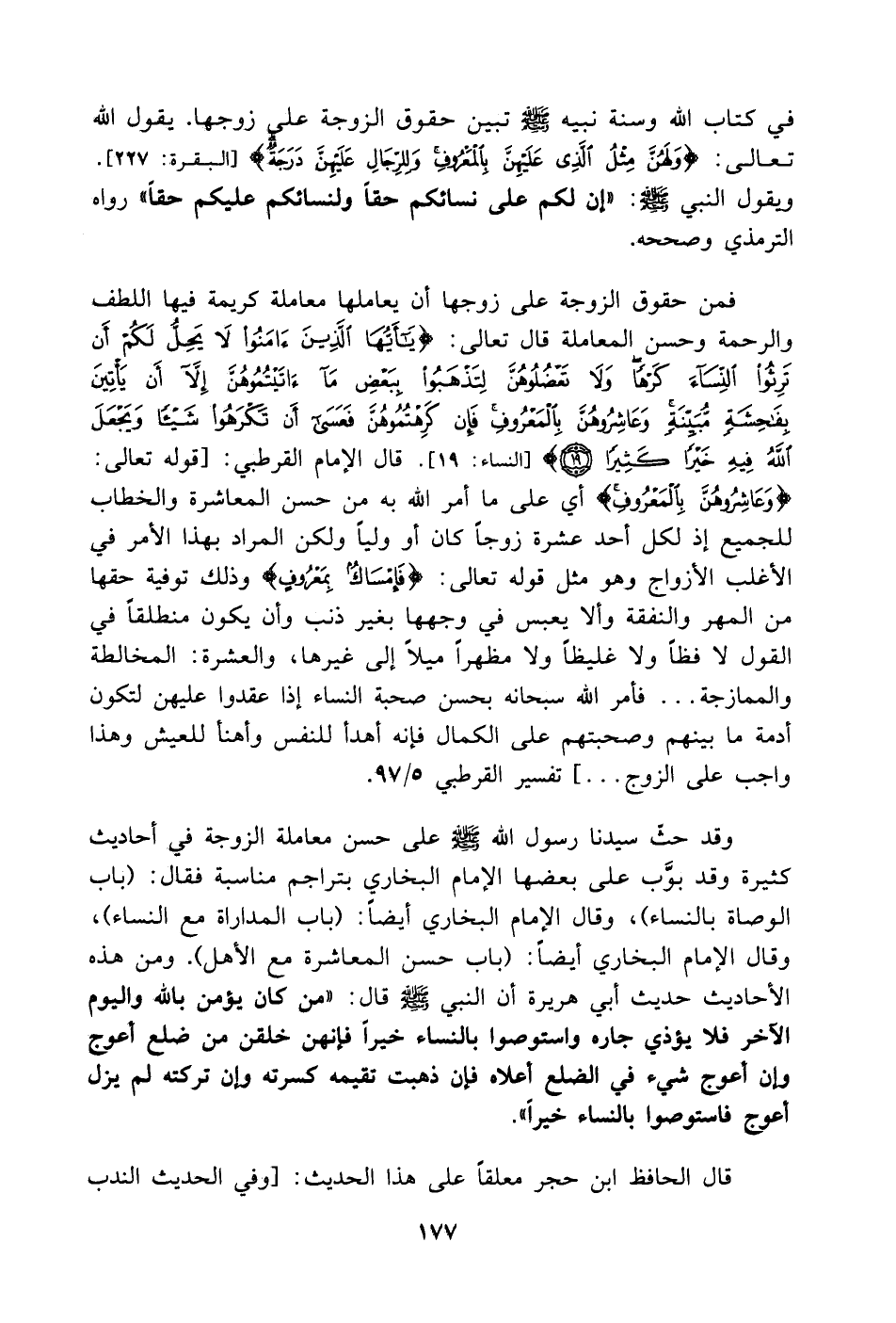 وقد حثّ سيدنا رسول الله - صَلَّى اللهُ عَلَيْهِ وَسَلَّمَ - على حسن معاملة الزوجة في أحاديث كثيرة وقد بوَّب على بعضها الإمام البخاري بتراجم مناسبة فقال: (باب الوصاة بالنساء)، وقال الإمام البخاري أيضاً: (باب المداراة مع النساء)، وقال الإمام البخاري أيضاً: (باب حسن المعاشرة مع الأهل). ومن هذه الأحاديث حديث أبي هريرة أن النبي- صَلَّى اللهُ عَلَيْهِ وَسَلَّمَ - قال: (من كان يؤمن بالله واليوم الآخر فلا يؤذي جاره واستوصوا بالنساء خيراً فإنهن خلقن من ضلع أعوج وإن أعوج شيء في الضلع أعلاه فإن ذهبت تقيمه كسرته وإن تركته لم يزل أعوج فاستوصوا بالنساء خيراً).