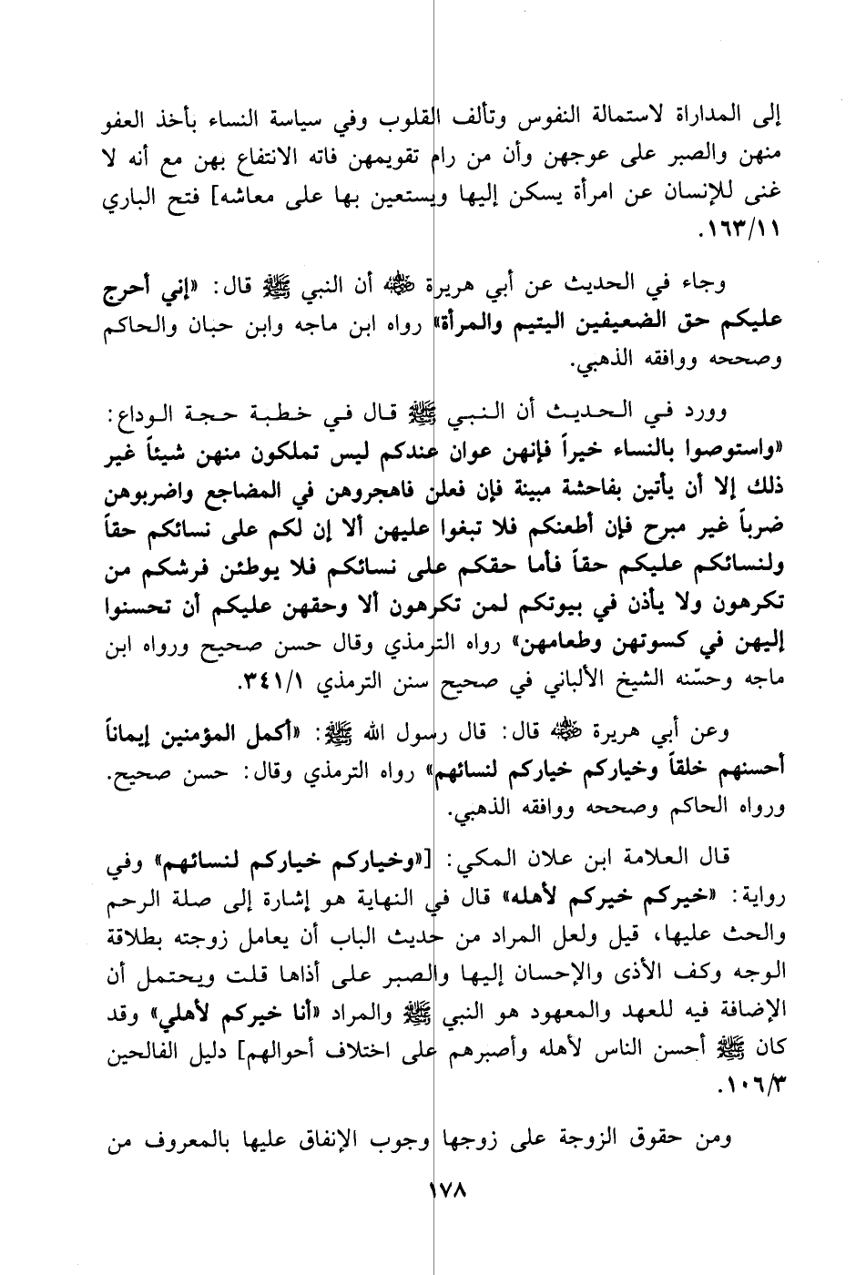 وورد في الحديث أن النبي - صَلَّى اللهُ عَلَيْهِ وَسَلَّمَ - قال في خطبة حجة الوداع: (واستوصوا بالنساء خيراً فإنهن عوان عندكم ليس تملكون منهن شيئاً غير ذلك إلا أن يأتين بفاحشة مبينة فإن فعلن فاهجروهن في المضاجع واضربوهن ضرباً غير مبرح فإن أطعنكم فلا تبغوا عليهن ألا إن لكم على نسائكم حقاً ولنسائكم عليكم حقاً فأما حقكم على نسائكم فلا يوطئن فرشكم من تكرهون ولا يأذن في بيوتكم لمن تكرهون ألا وحقهن عليكم أن تحسنوا إليهن في كسوتهن وطعامهن) رواه الترمذي وقال حسن صحيح ورواه ابن ماجة وحسّنه الشيخ الألباني في صحيح سنن الترمذي 1/ 341.