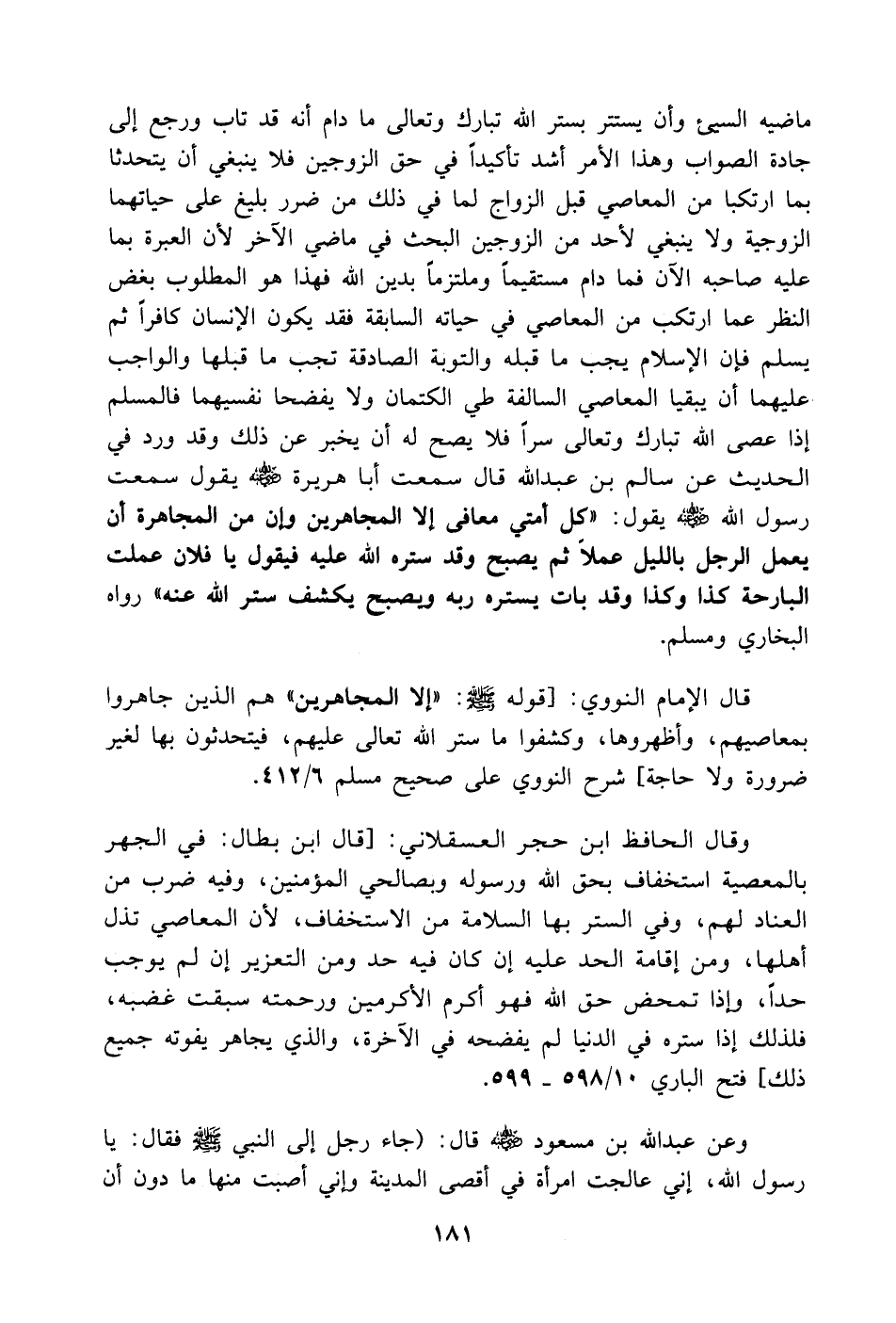 وقال الحافظ ابن حجر العسقلاني: [قال ابن بطال: في الجهر بالمعصية استخفاف بحق الله ورسوله وبصالحي المؤمنين, وفيه ضرب من العناد لهم, وفي الستر بها السلامة من الاستخفاف, لأن المعاصي تذل أهلها, ومن إقامة الحد عليه إن كان فيه حد ومن التعزير إن لم يوجب حداً, وإذا تمحض حق الله فهو أكرم الأكرمين ورحمته سبقت غضبه, فلذلك إذا ستره في الدنيا لم يفضحه في الآخرة, والذي يجاهر يفوته جميع ذلك] فتح الباري 10/ 598 - 599.