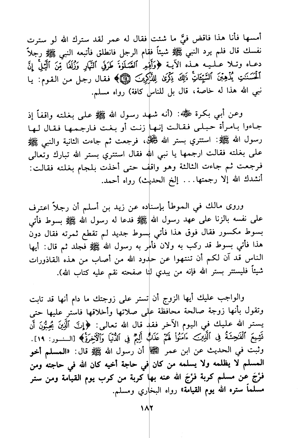 وروى مالك في الموطأ بإسناده عن زيد بن أسلم أن رجلاً اعترف على نفسه بالزنا على عهد رسول الله - صَلَّى اللهُ عَلَيْهِ وَسَلَّمَ - فدعا له رسول الله - صَلَّى اللهُ عَلَيْهِ وَسَلَّمَ - بسوط فأتي بسوط مكسور فقال فوق هذا فأتي بسوط جديد لم تقطع ثمرته فقال دون هذا فأتي بسوط قد ركب به ولان فأمر به رسول الله - صَلَّى اللهُ عَلَيْهِ وَسَلَّمَ - فجلد ثم قال: أيها الناس قد آن لكم أن تنتهوا عن حدود الله من أصاب من هذه القاذورات شيئاً فليستتر بستر الله فإنه من يبدي لنا صفحته نقم عليه كتاب الله).